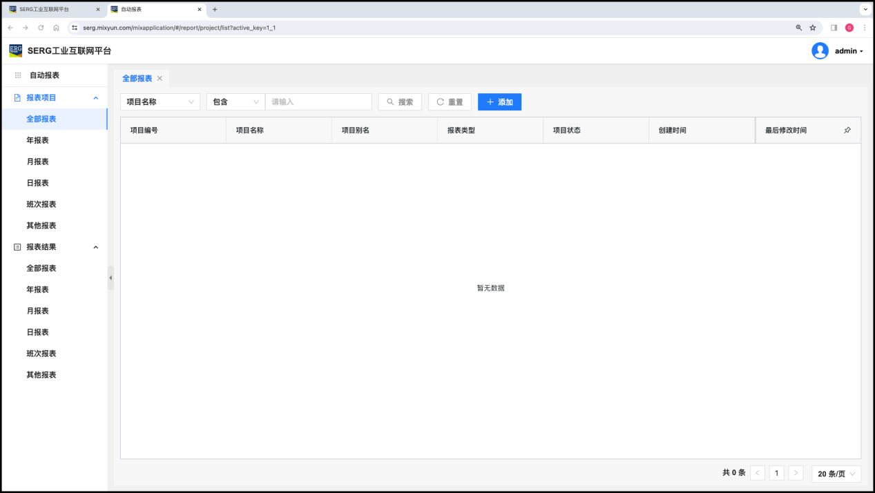 “自动报表” 应用有两个菜单版块:报表项目板块 和 报表结果板块。