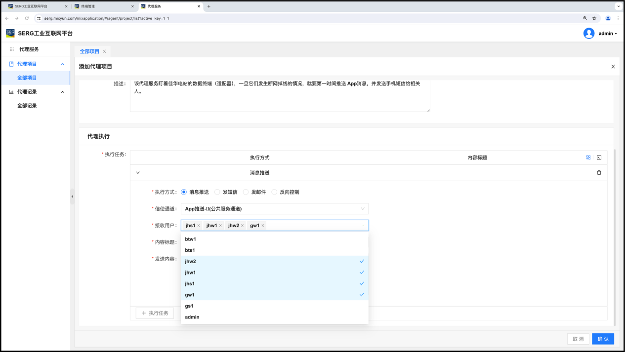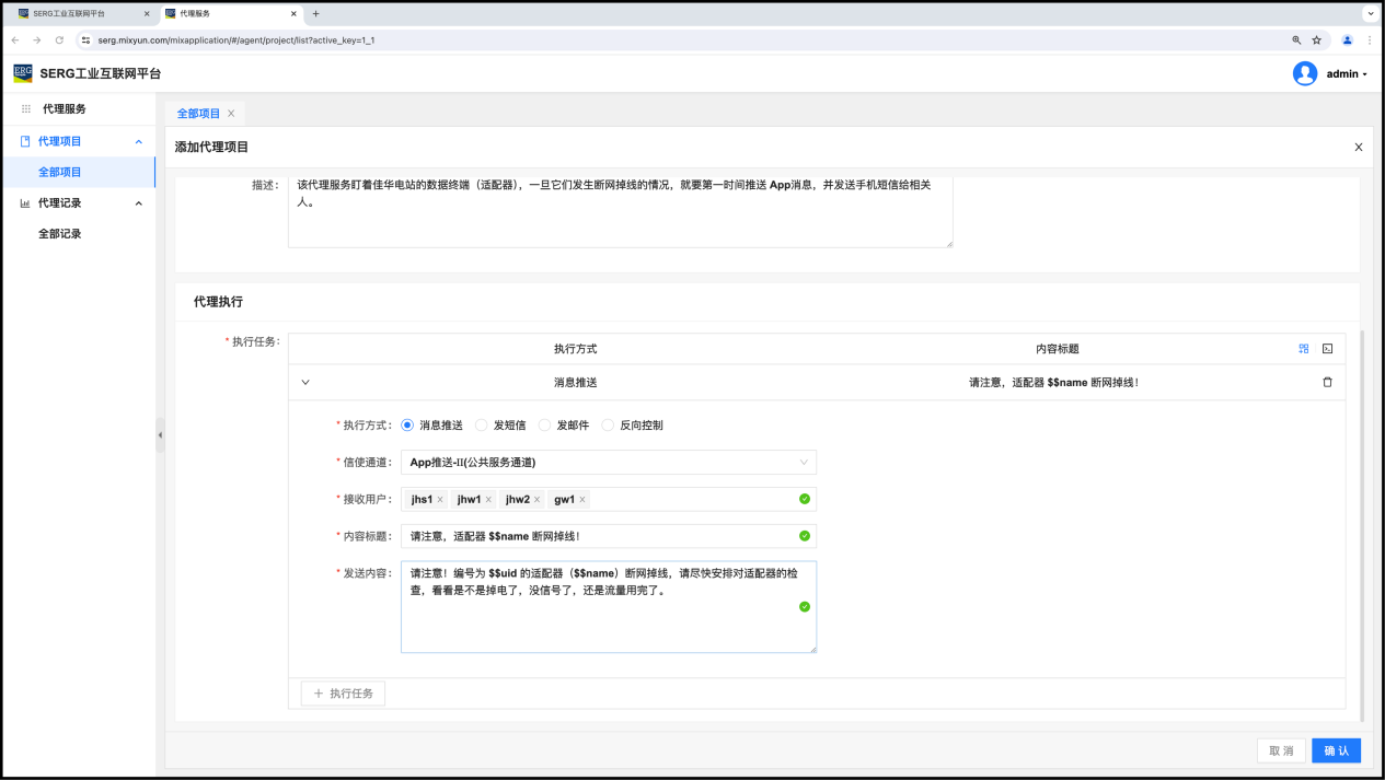 因为我们创建的这个代理执行,也就是App消息推送规则是:当佳华电站的适配器断网掉线的情况发生后,App消息只推给佳华电站的主管(陈大明)和工作人员周雪、赵思曼以及集团的工作人员孙亚男。