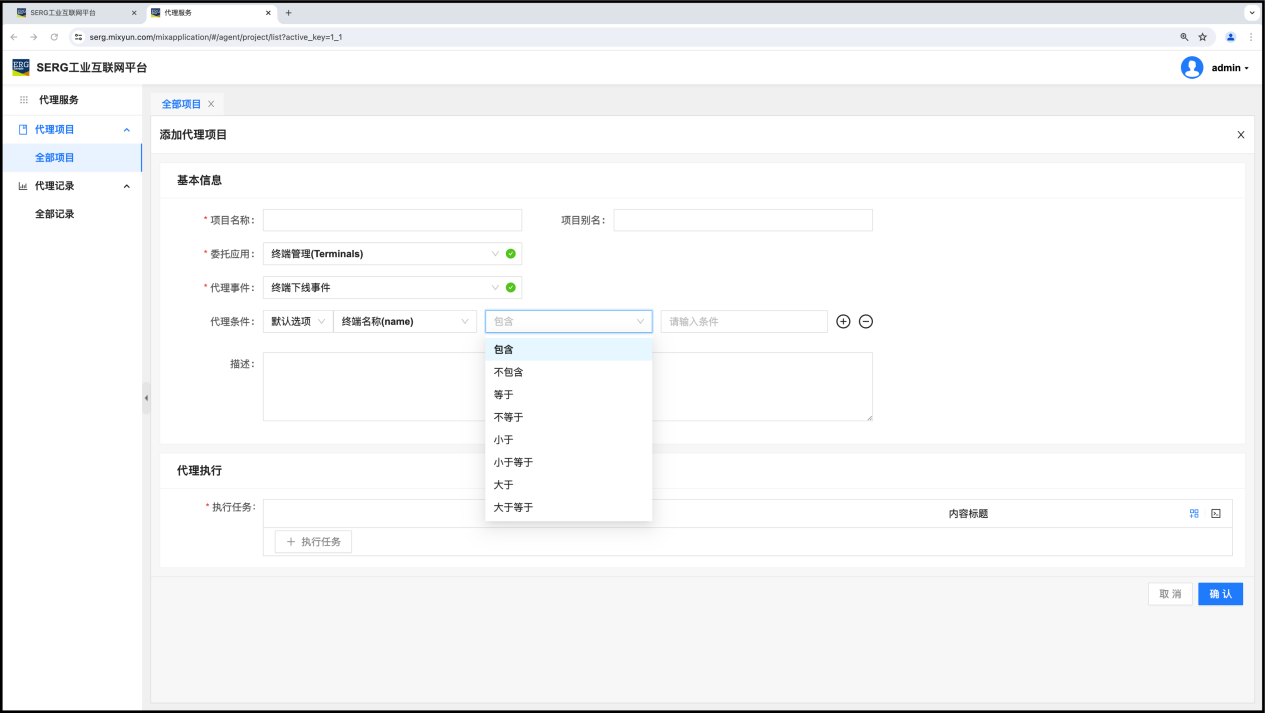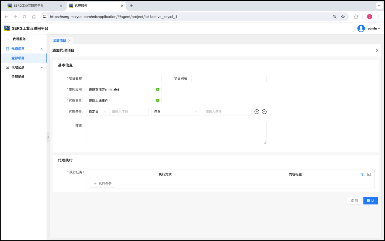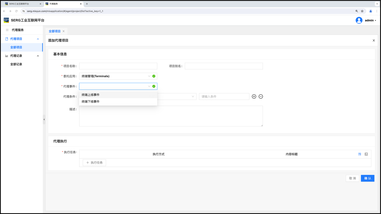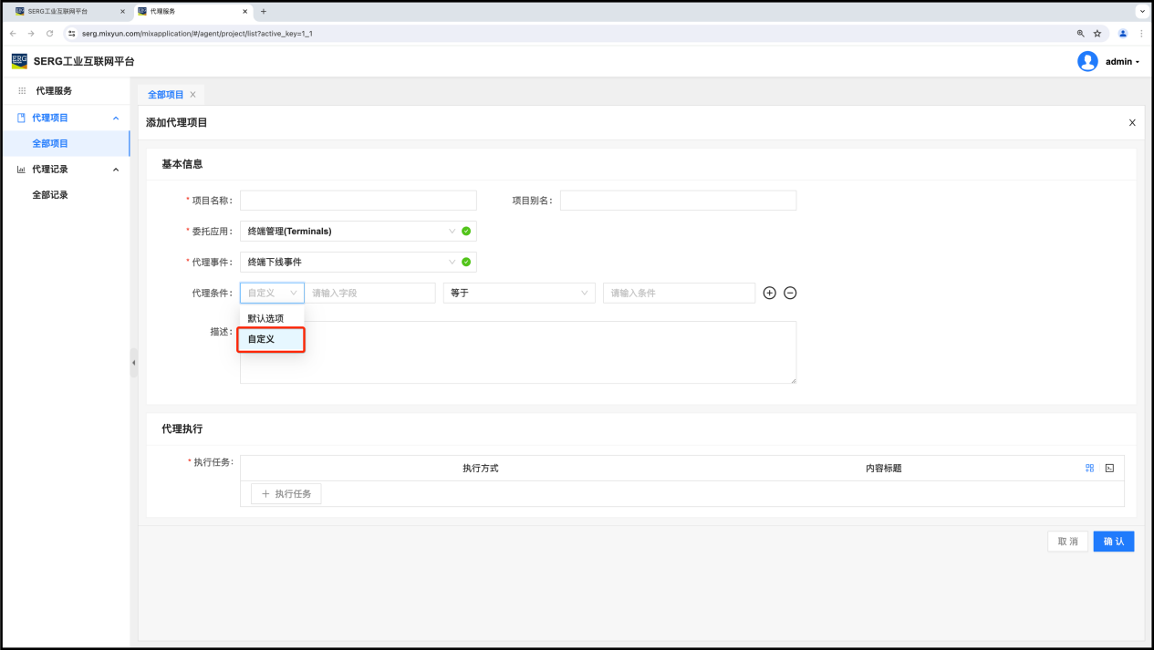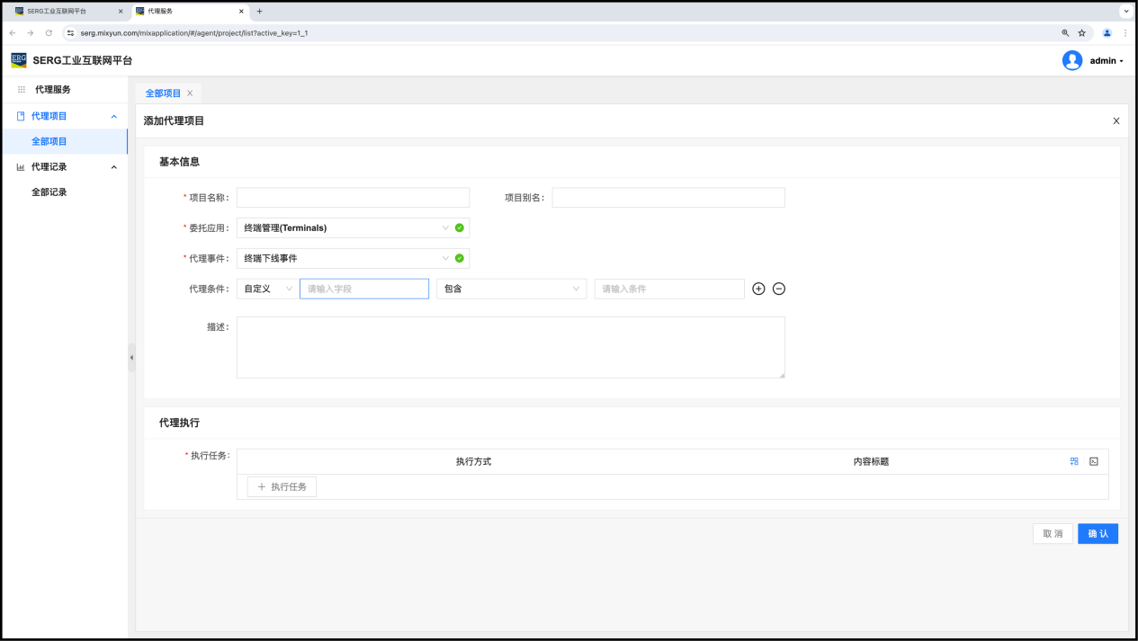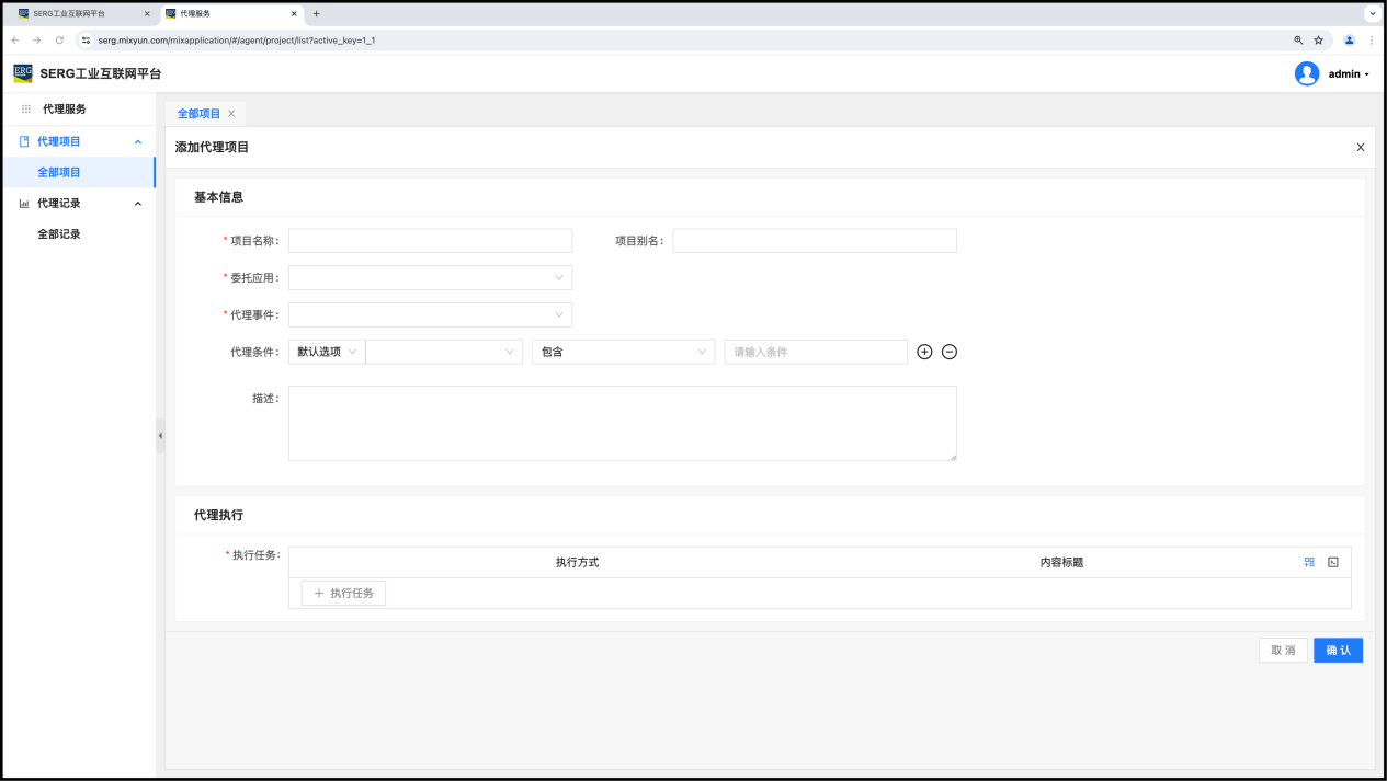 “代理服务” 应用有两个板块,“代理服务项目” 板块和 “代理记录” 板块。代理服务项目板块是管理代理服务项目的;而代理记录板块是记录代理执行结果的。