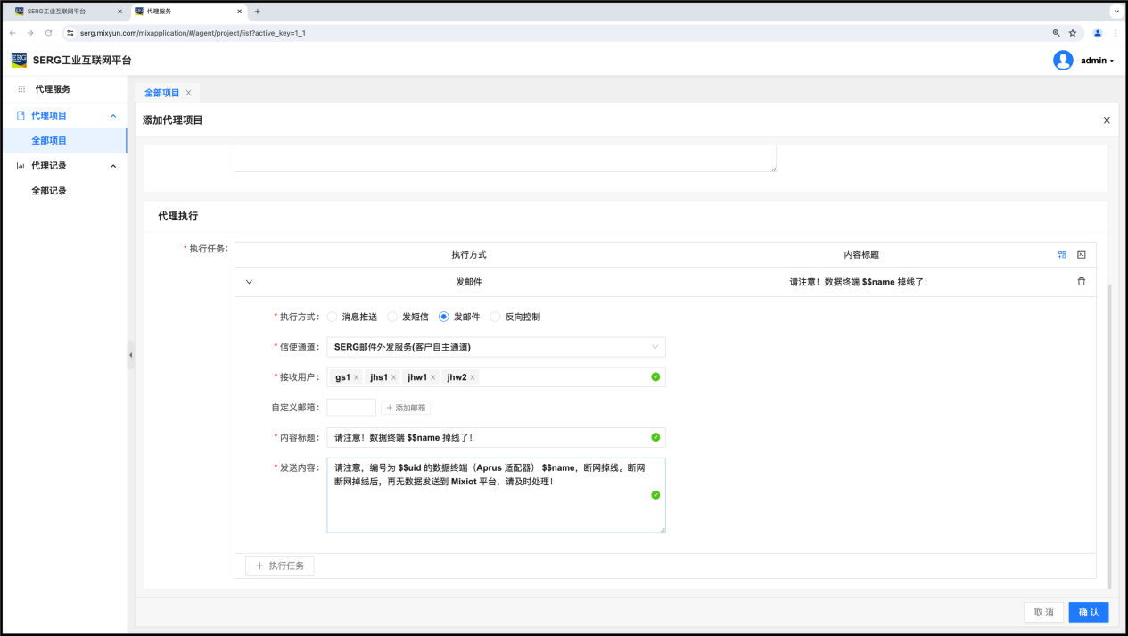 跟 App消息推送和手机短信推送一样,选择邮件通道、邮件接收人。除了 MixIOT 注册用户外, 也可以增加 MixIOT 域外的电子邮件接收者。