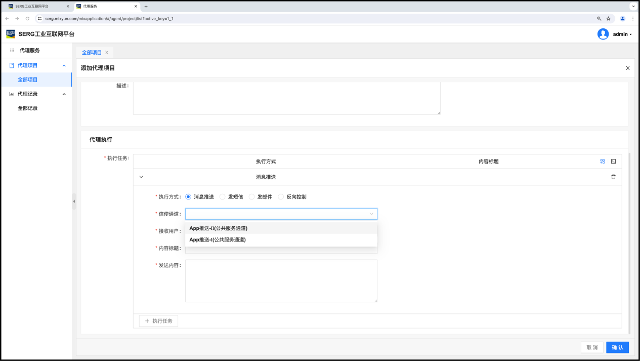 代理执行的任务有四种,分别是:App消息推送、手机短信推送、电子邮件推送和反向控制。