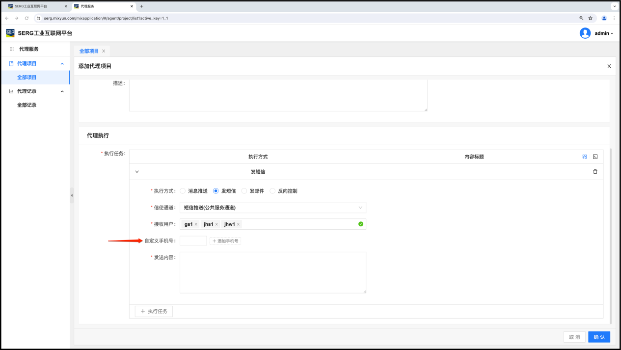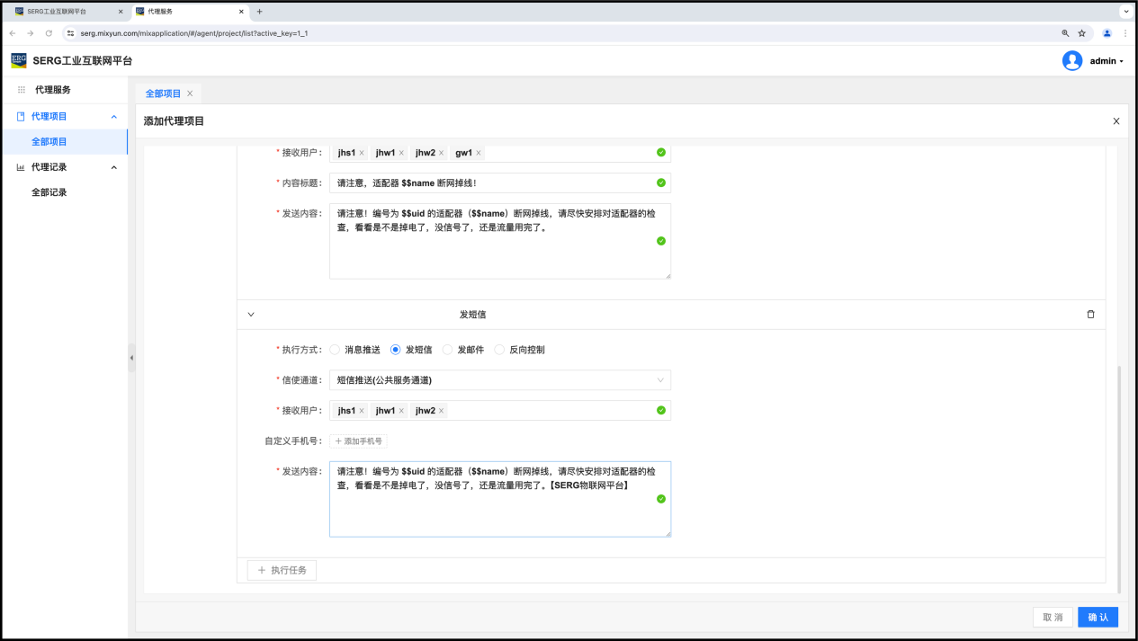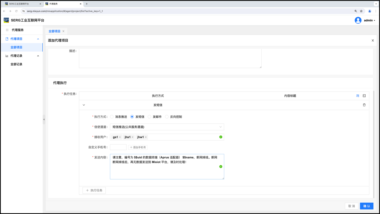 除了 MixIOT 在册的用户之外,如果需要的话,还可以直接指定接收手机短信的手机号: