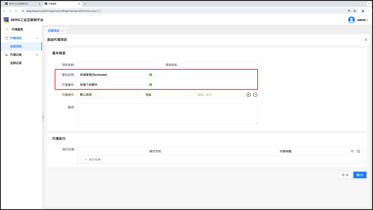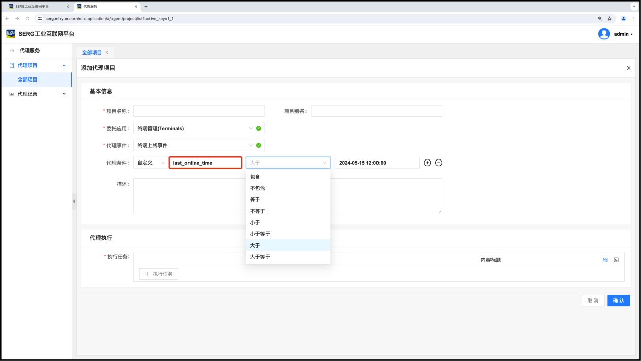 确定了这个代理项目所代理的事件是终端下线事件,那就可以做进一步的条件设定: