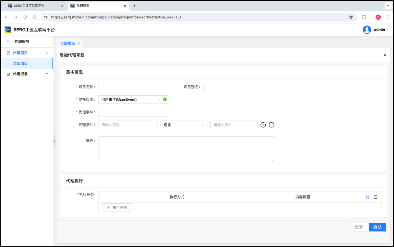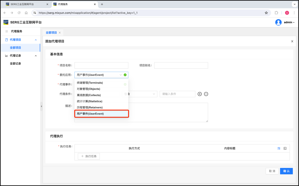用户事件的代理,做法完全一样,需要自行填写代理事件的标识(名称)以及代理条件: