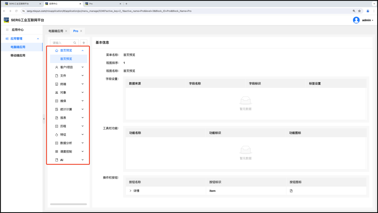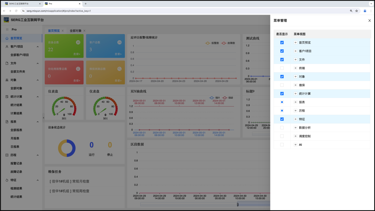 SERG集团普通 MixIOT 用户看到的右侧打开的这个 “菜单管理” 里面出现的内容是 MixIOT Pro 应用默认的,但SERG集团的 MixIOT 管理员可以对这些设置进行调整,比如增减菜单项、增减视图。