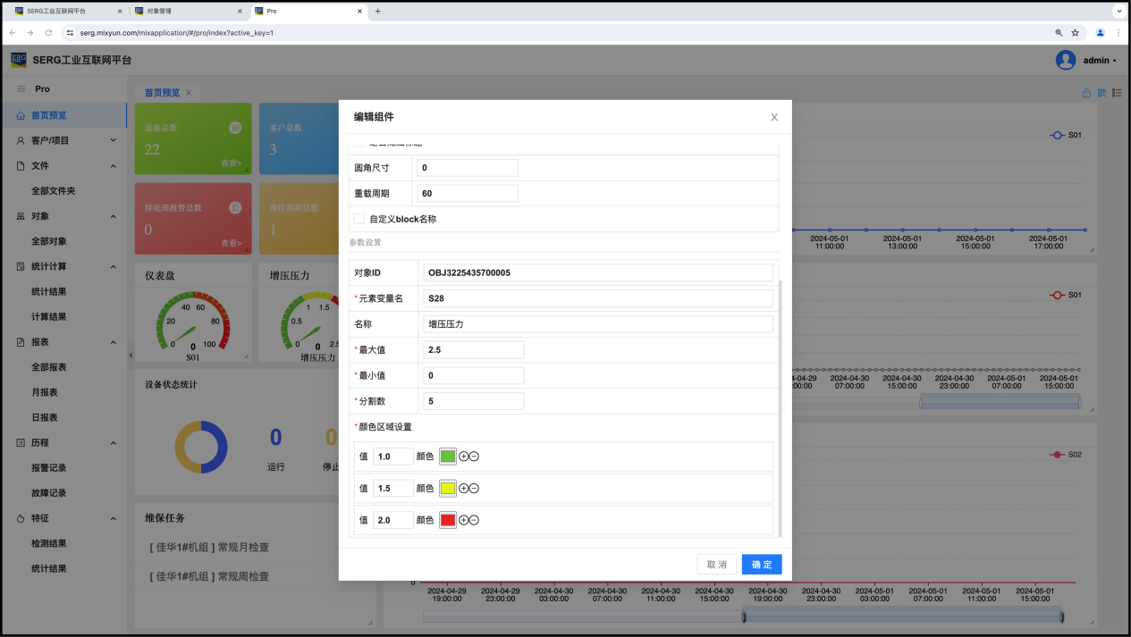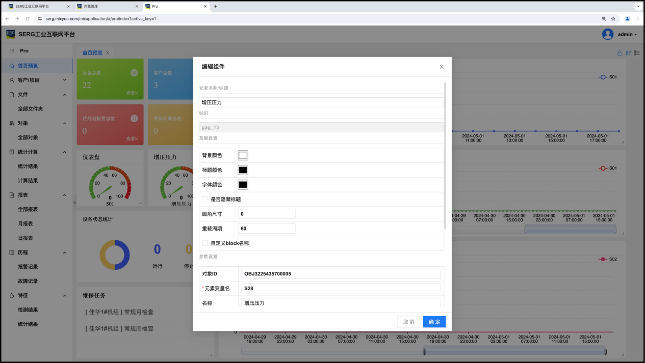 以上图中的“仪表盘”组件为例,我们可以设定该仪表盘组件的名称(增压压力),以及这个元素的值对应的是对象编号(OBJ3225435700005)和 FV 变量(S28)。
