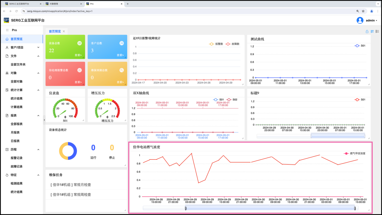 这个组件就编辑(配置)完成了,这个组件就是显示佳华1#机组对象的增压压力。也可以把右下部分的区段数据配置成佳华电站的燃气浓度曲线:
