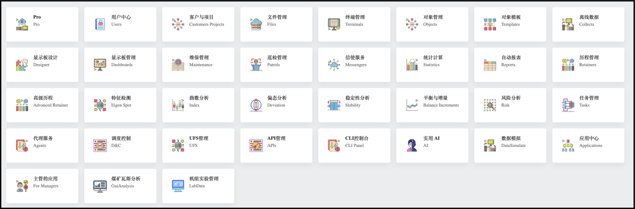 “Pro”应用看上去没有任何属于自己的内容,那为什么需要Pro呢?为什么Pro非常重要呢?我们看—下 MixIOT 全部应用: