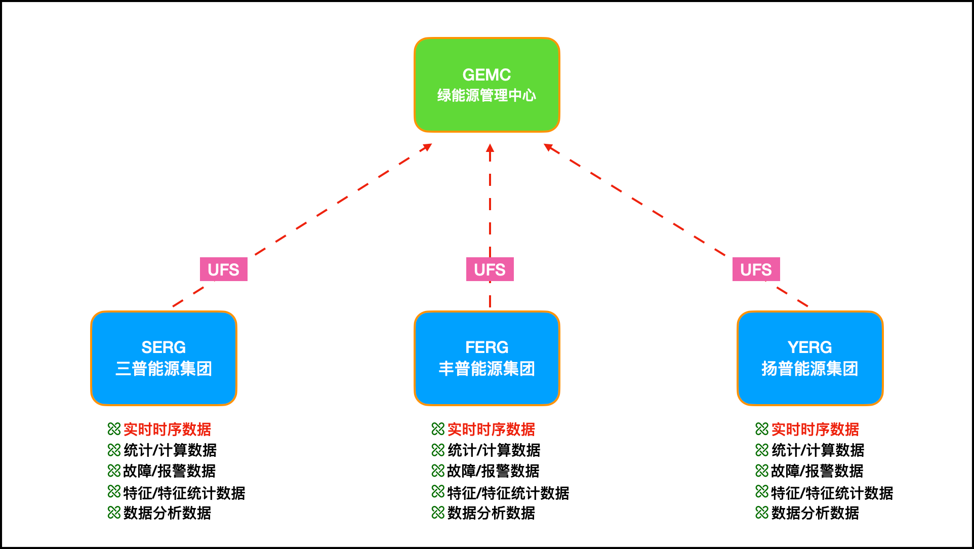假设 GEMC(绿能管理中心)也使用了 MixIOT,这个时候,只需要让 SERG、FERG 和 YERG 三个集团按GEMC的要求,把需要上报的数据通过 UFS 报给GEMC就行了。
