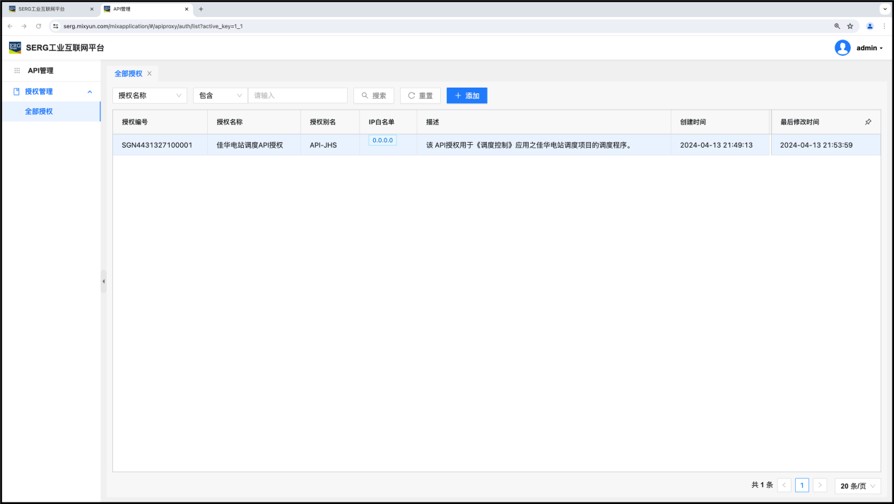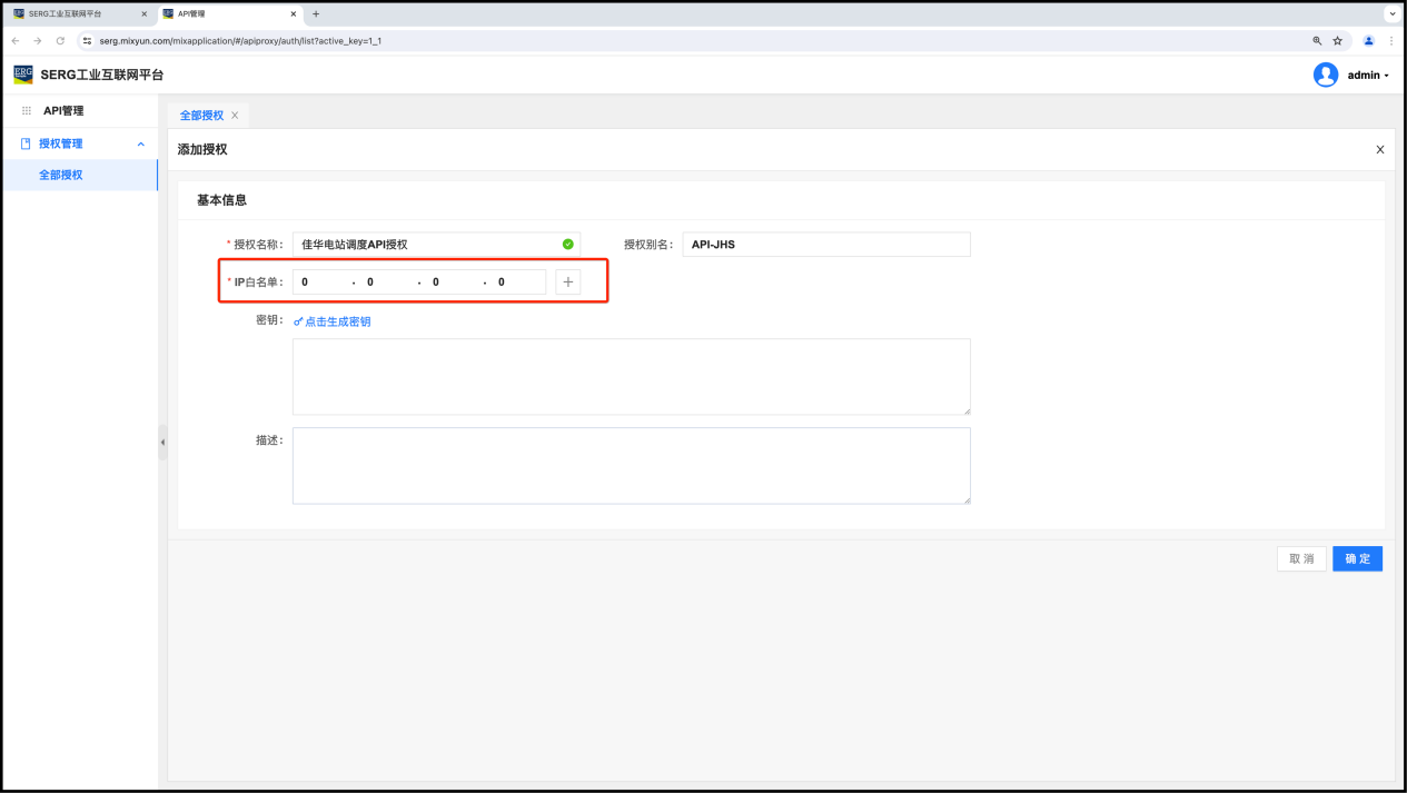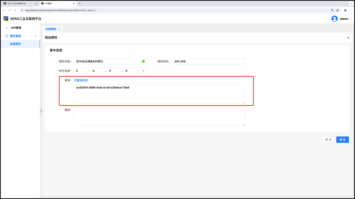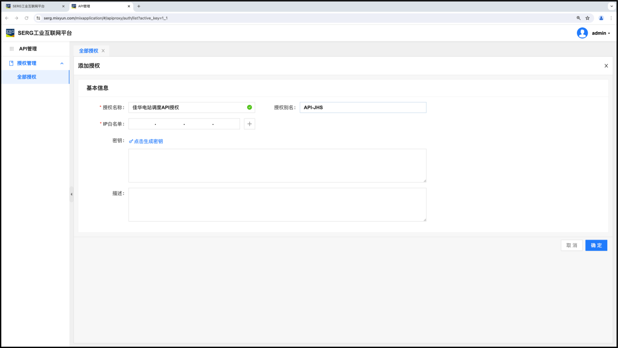 给这个授权取一个名字和别名,比如佳华电站调度API授权(API-JHS):