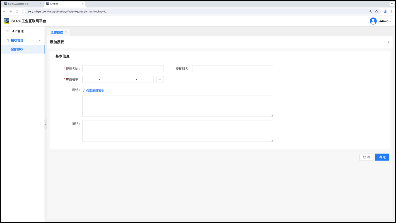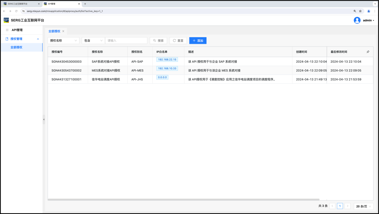 一个 API 授权也可以同时给多个IP地址使用, 比如,如果 MixIOT 需要同时对接 CRM、ERP 和 MES,这个三个对接的 API 也可以使用同一个授权。我们可以通过 “+” 增加 IP白名单。