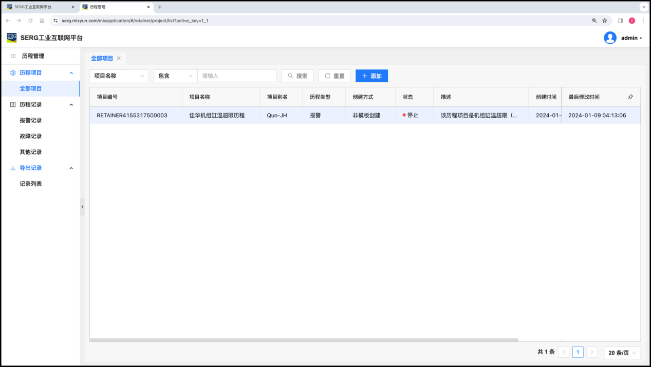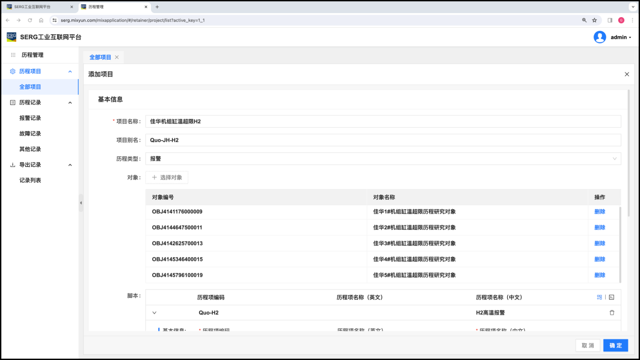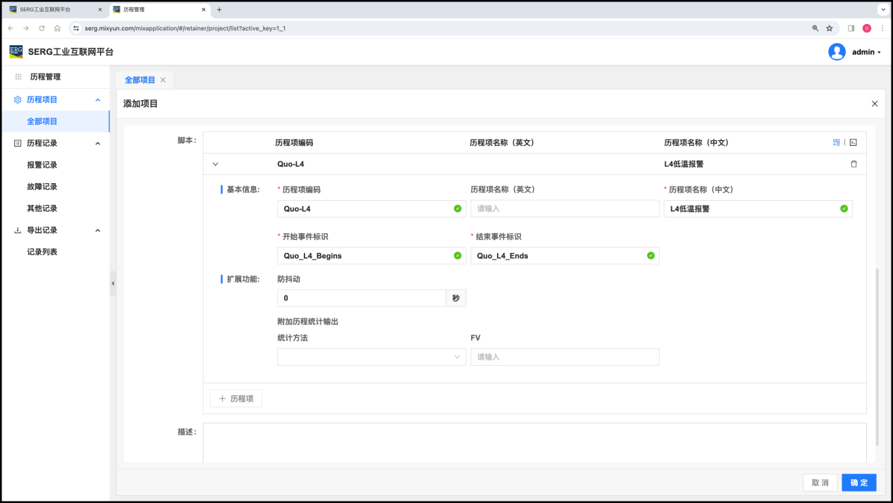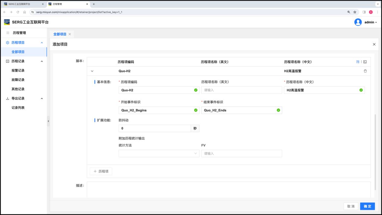 在 “历程管理” 应用中,我们创建了 Quo-JH 历程项目,该项目包括了 Quo-L(气缸低温报警)和 Quo-H(气缸高温报警)两个历程项。