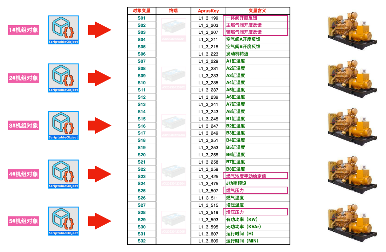 从前面计算燃气当量的计算公式可以知道,我们需要每台机组的 S01(一体阀开度)、S02(主燃气阀开度)、S03(辅燃气阀开度)、S23(燃气浓度给定值)、S25(燃气压力) 和 S28(增压压力),还有机组的 S24(J功率预设)和 S29(有功功率)。