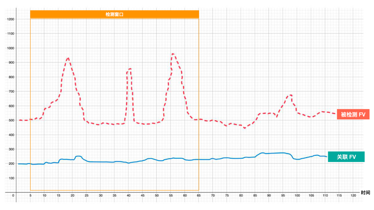 比如,上面这个被检测FV数据在检测窗口中出现了我们关注的跳跃,但这是不是我们正在寻找的特征,还取决于另一个相关FV的情况,是不是基本平稳而没有什么大波动。只有这两个条件(被检测FV出现跳跃,以及关联FV基本平稳)同时成立,才算是特征成立。