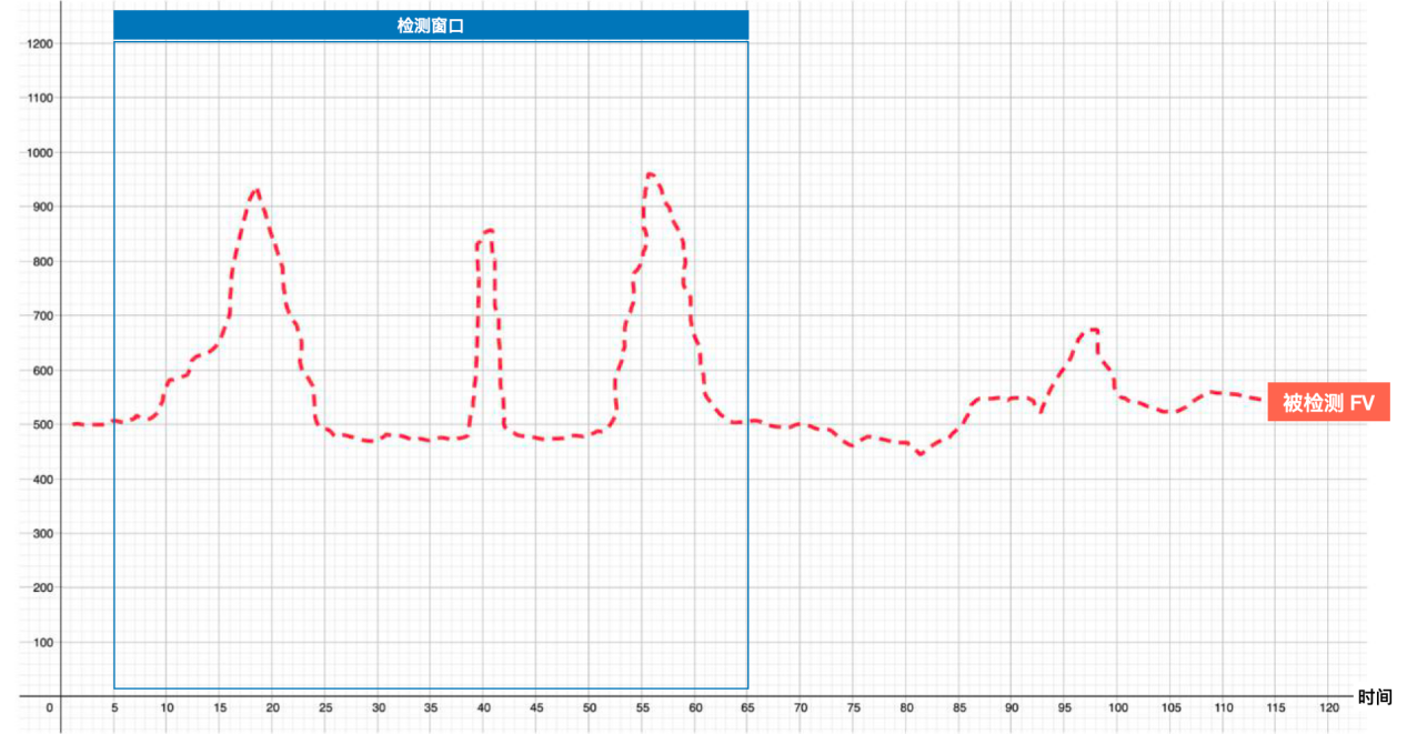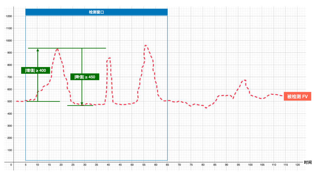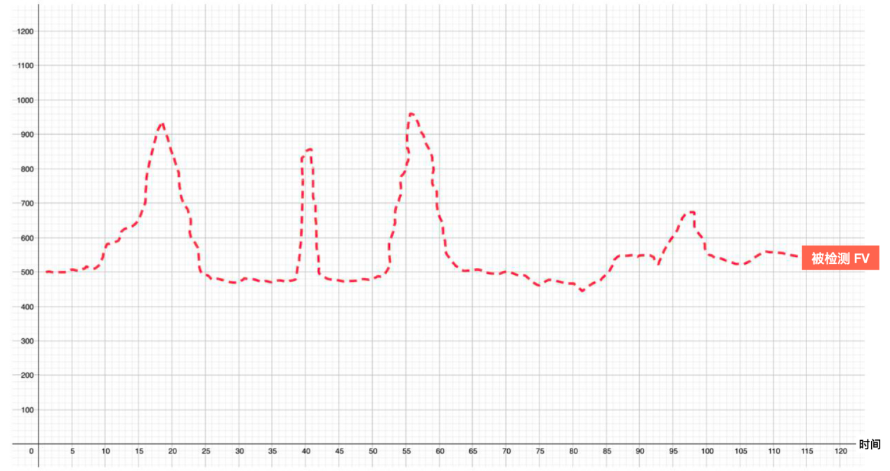 从这个数据曲线很容易发现,被检测FV在 “1分钟内有3次跳跃”:
