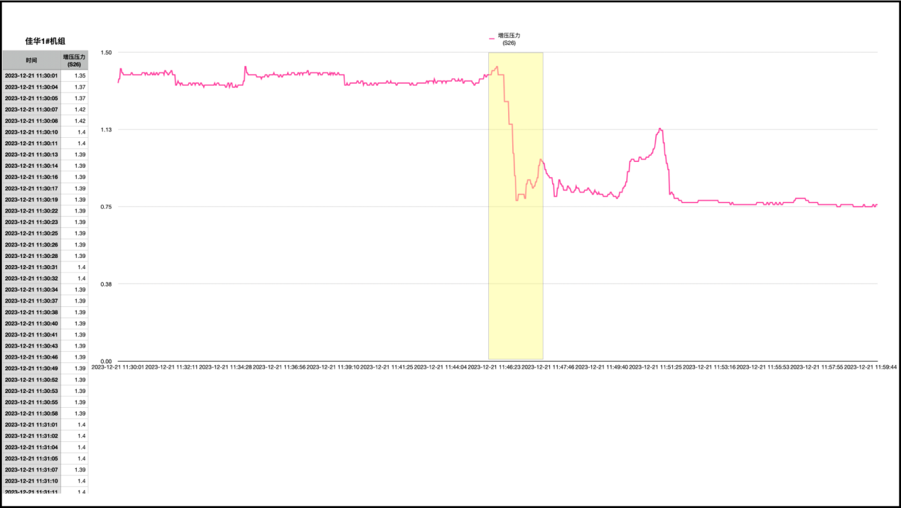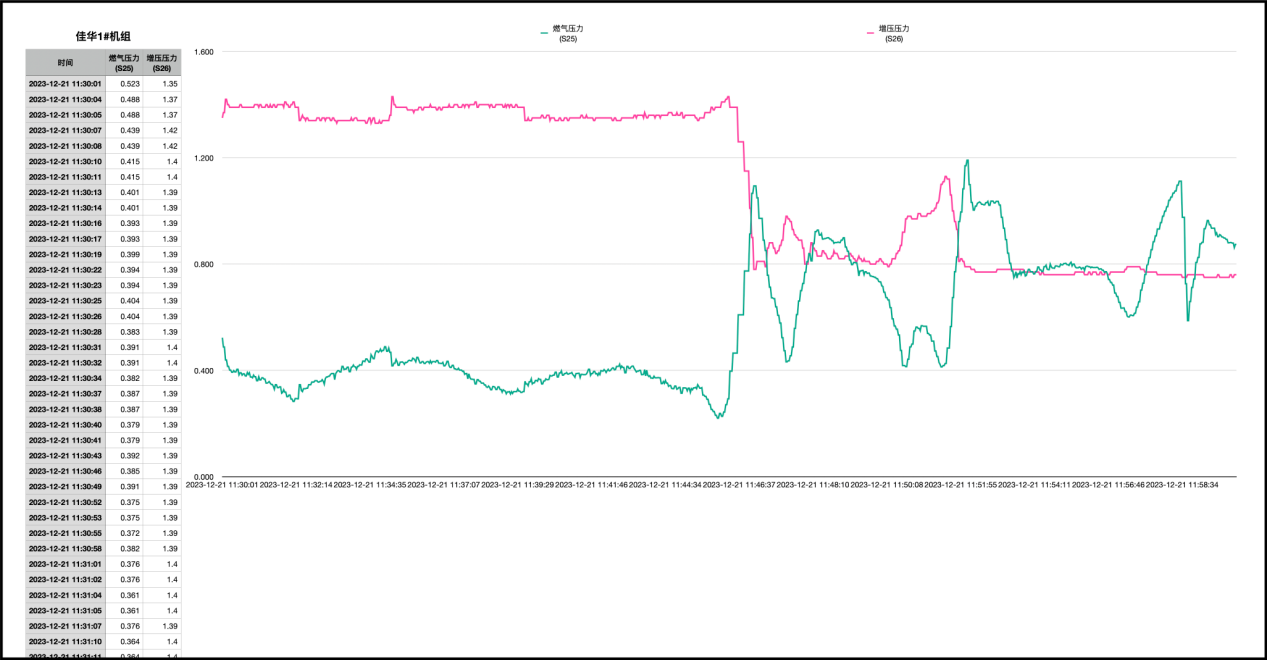 看一组佳华电站1#机组的燃气压力(S25)和增压压力(S26)在某一个时间段的数据:
