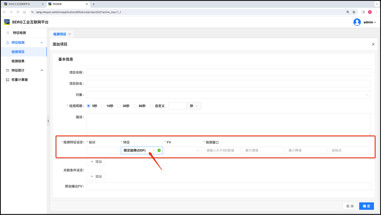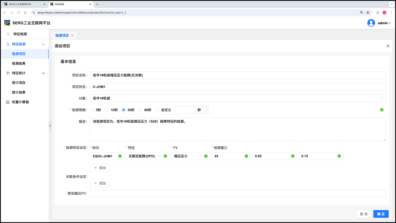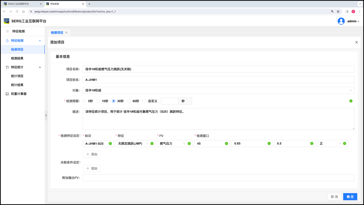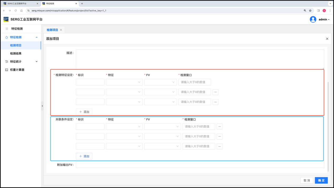 MixIOT “特征检测” 应用的特征检测项目,实际上是可以支持多个因素特征的,也支持多个关联因素。只需要按 “+添加”: