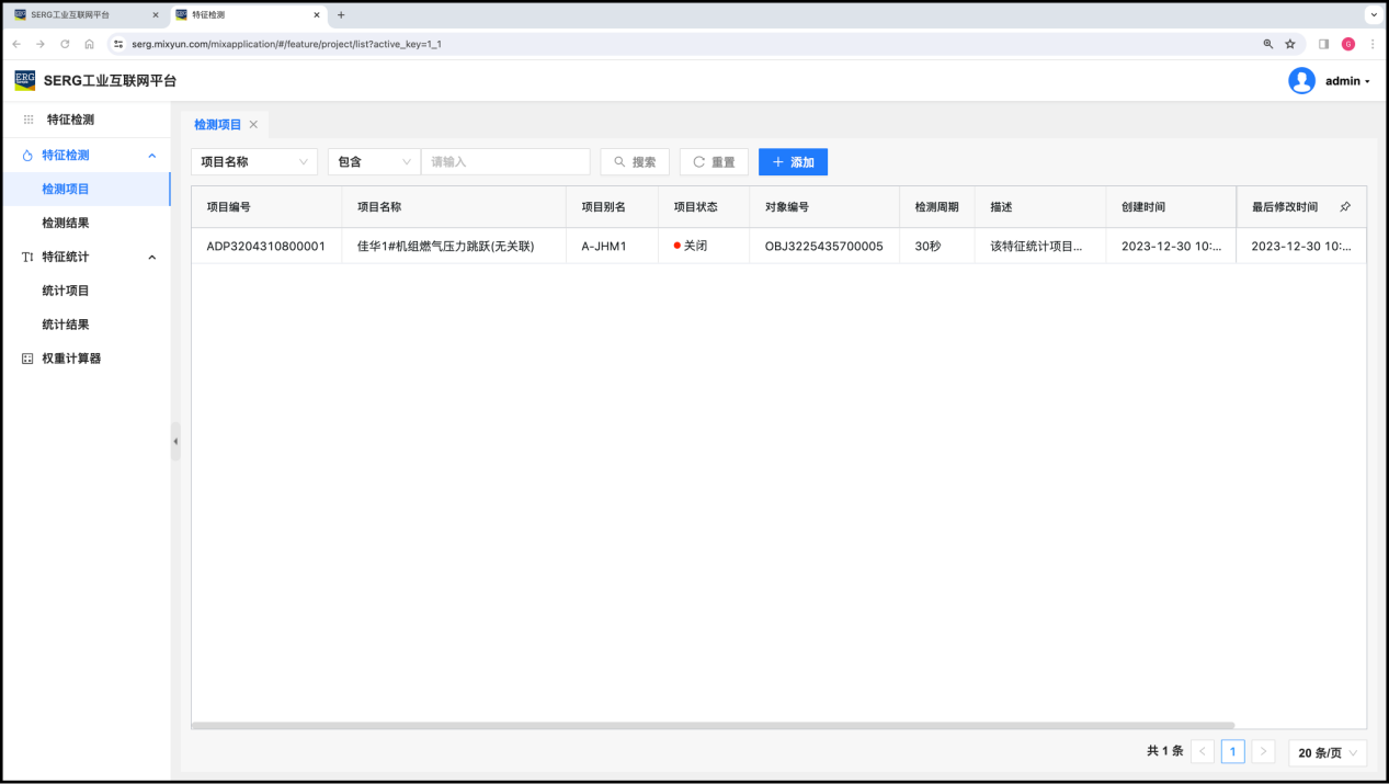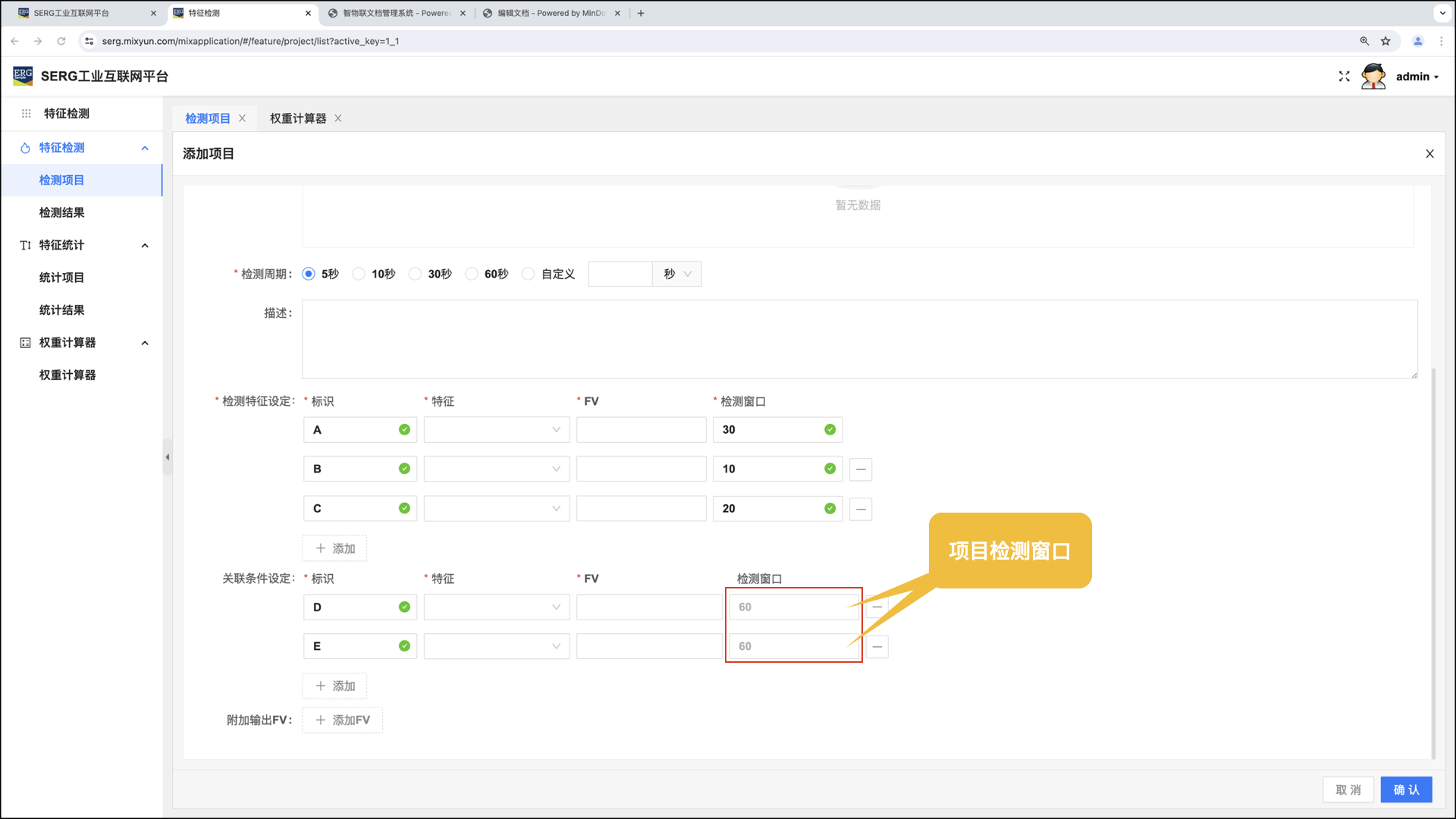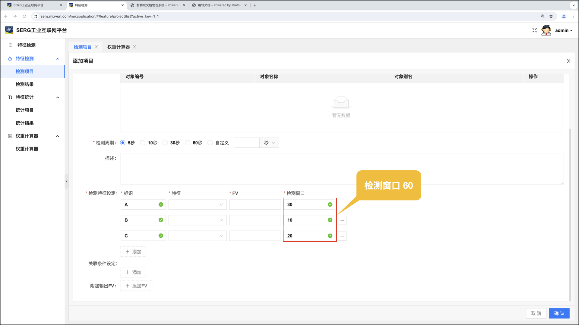 MixIOT “特征检测” 应用的特征检测项目,实际上是可以支持多个因素特征的,也支持多个关联因素。只需要按 “+添加”: