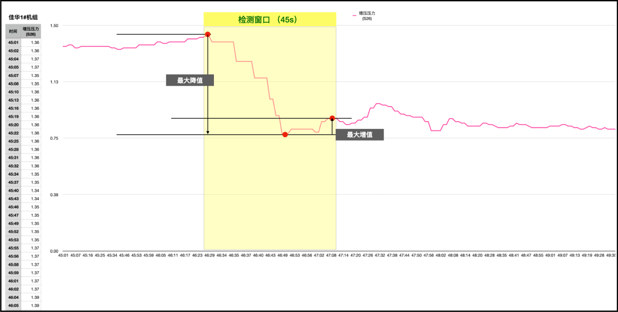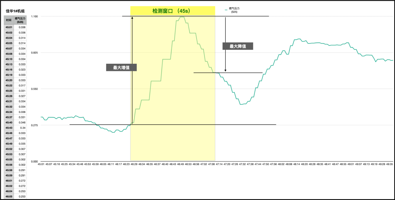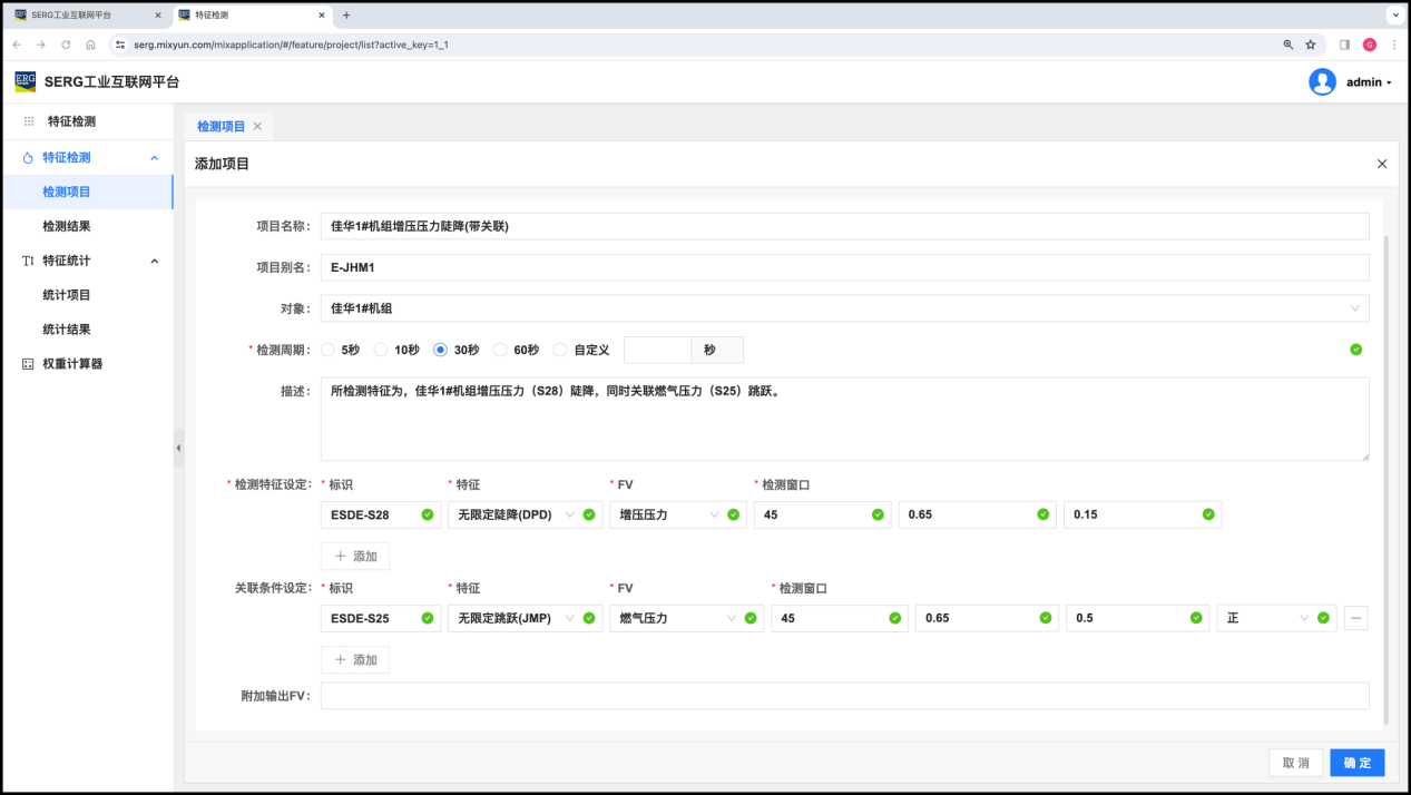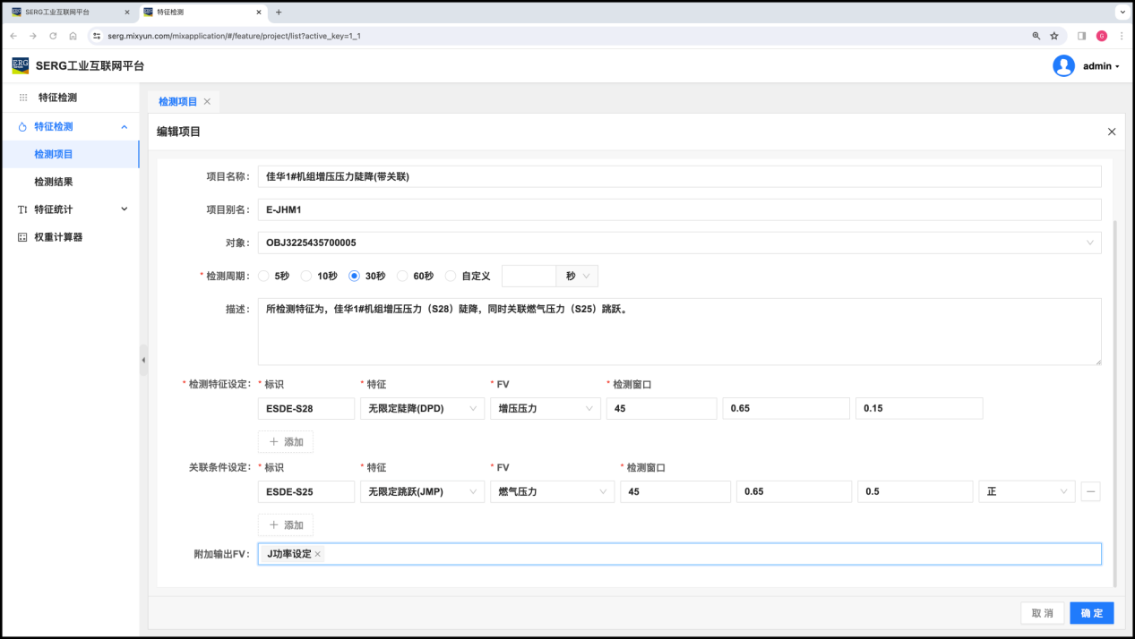 - 创建特征检测项目E,增压压力(S28)“陡降”,并有关联因素燃气压力(S25)的 “跳跃” 特征的检测项目;