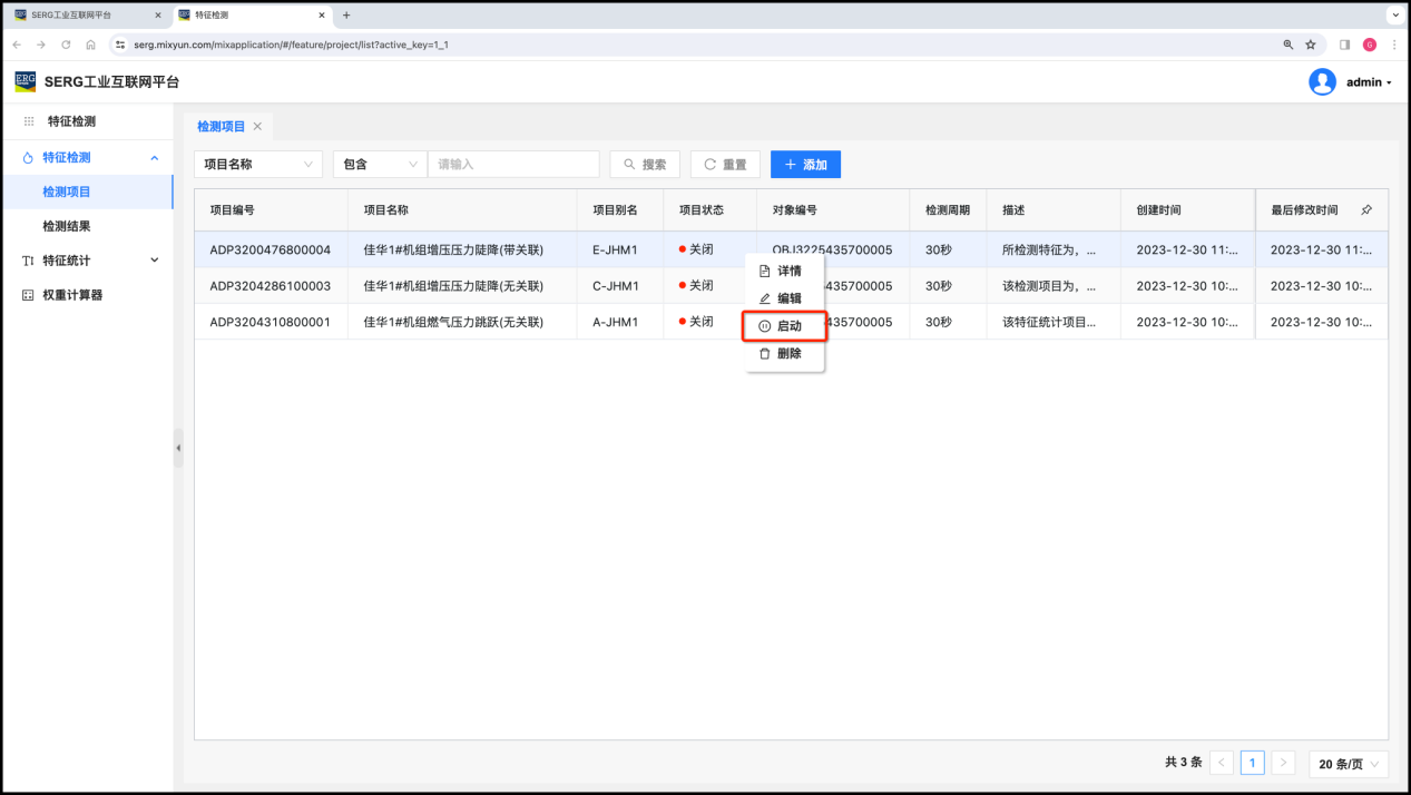 现在就完全创建好了三个特征检测项目。最后,还需要把特征检测项目启动起来:
