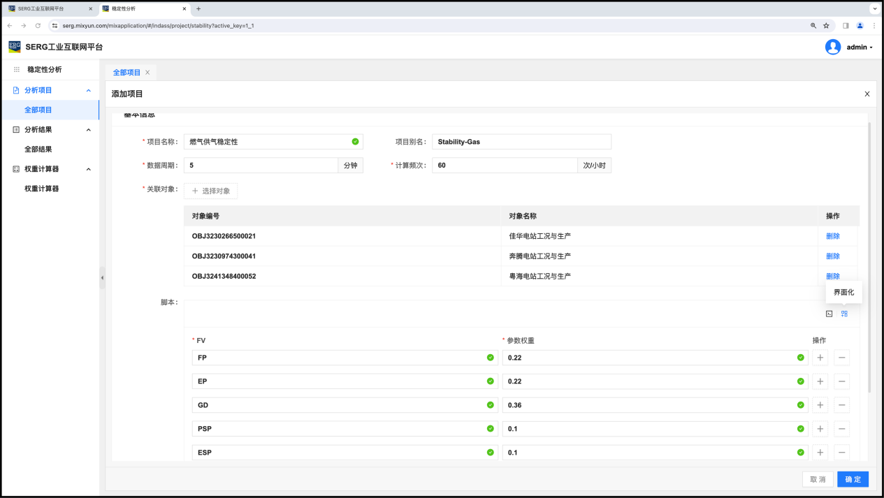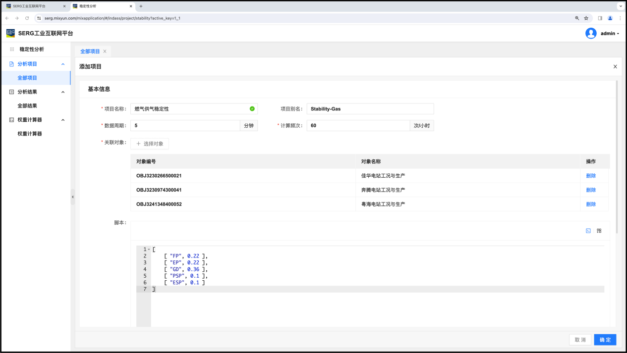 项目名称是 “燃气供气稳定性(Stability-Gas)”;每次计算的时候,都使用最近5分钟的数据;每分钟计算一次。我们可以用界面化来编辑脚本,它会自动转换成稳定性项目标准脚本: