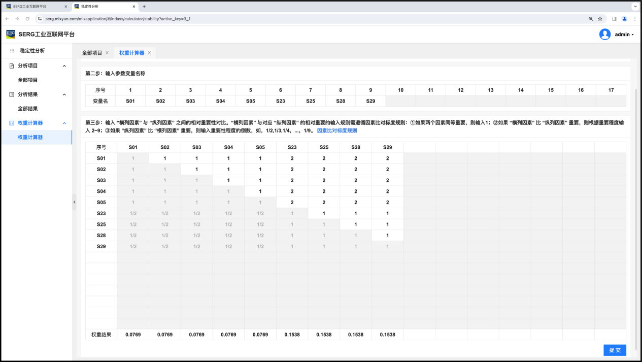 选择以下因素作为稳定性分析的权重因素,用权重计算器来计算这些因素的权重:
