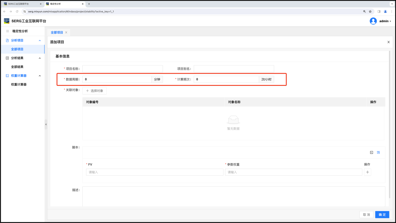 回头看一下,MixIOT Indass 的所有应用,包括 “稳定性分析” 应用,分析项目都有两个设置项,一个是 “数据周期”,另一个是 “计算频次”: