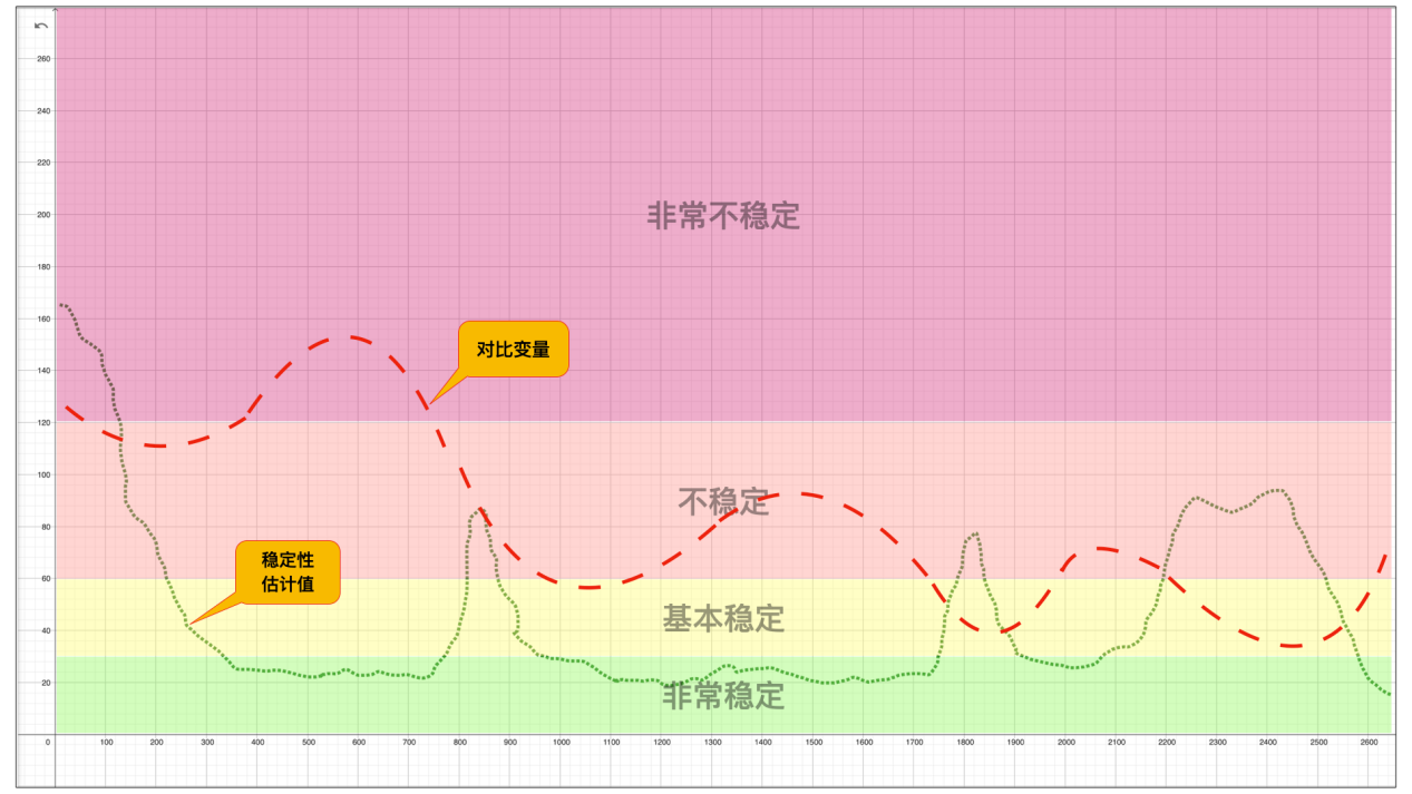 根据经验,我们可以大概确定一个稳定性估计值的区段范围,非常稳定、基本稳定、不稳定和非常不稳定:
