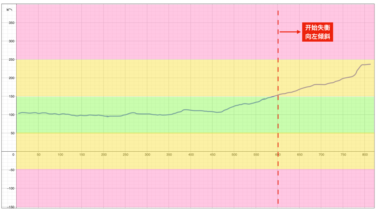 这也是一种 “相对平衡” 关系,同样,如果平衡估计值越来越大,说明出现失衡,而且这个时候方向是在 “左” 边,也就是平衡板会向左边倾斜;如果平衡估计值越变越小,说明这个失衡的方向是向右边倾斜。
