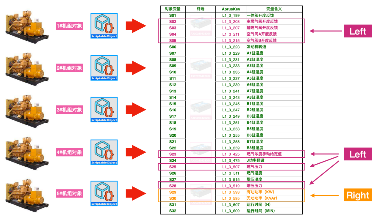 Right(右)是跟机组输出功率有关的,包括 S29、S30(有功功率、无功功率)。