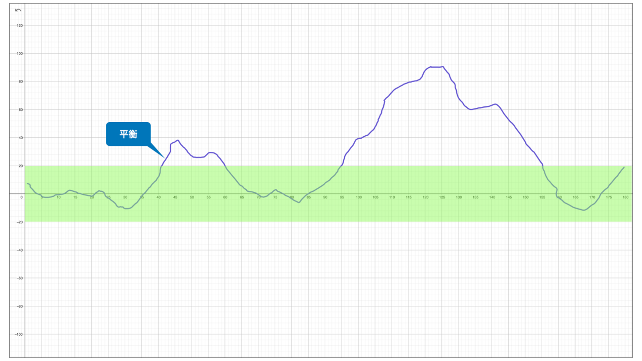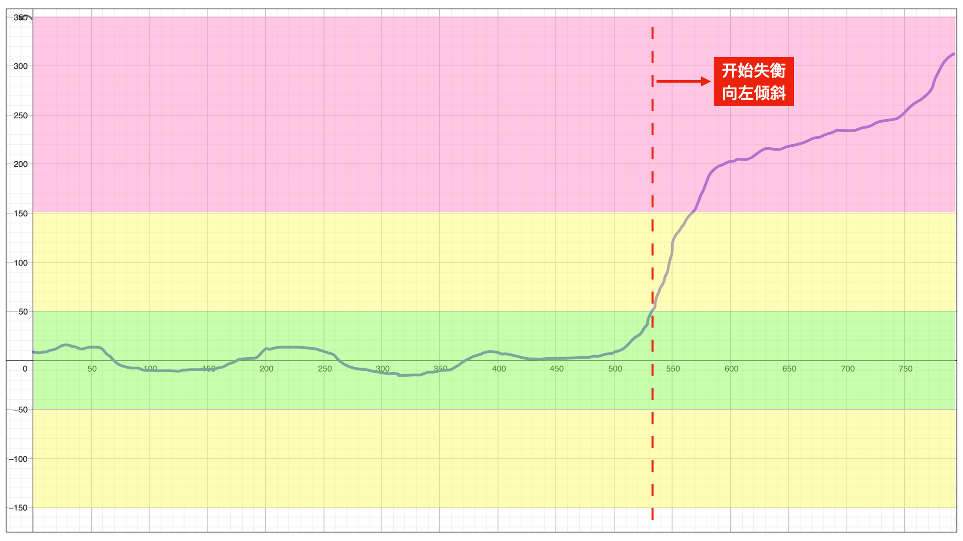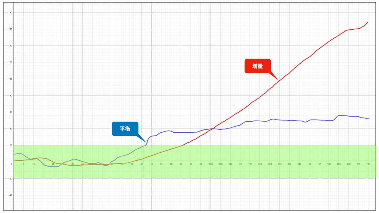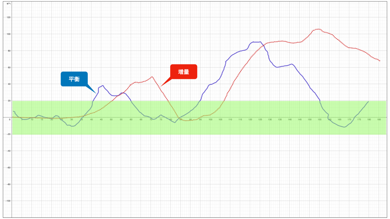 通过观察,我们大致可以确定,平衡估计值在 -50~+50 这个区间,是输入输出的一个相对平衡关系。在 500 分钟后,平衡估计值增加,说明这种相对平衡关系被打破,并向左侧(输入侧)倾斜,可以理解为,输入的多,而输出的不足。