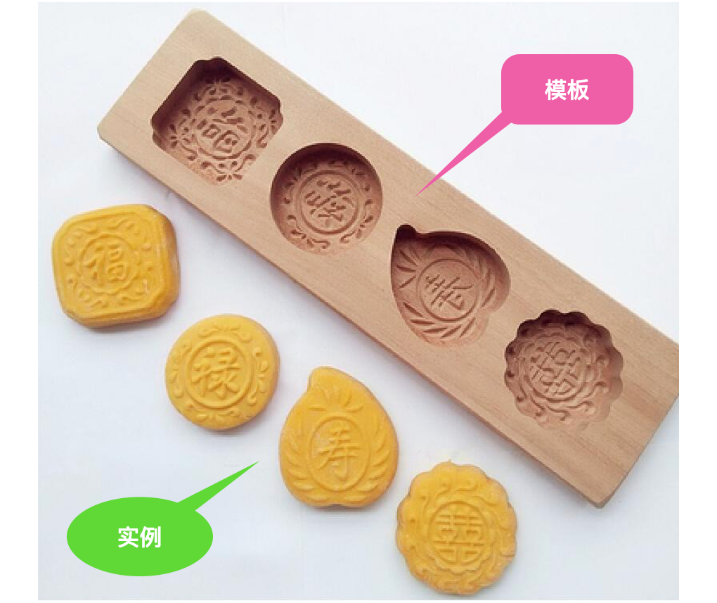 比如我们做月饼时候会使用一个月饼模子,把需要在月饼上呈现的样式、花纹、文字,都刻在这个模子上。
