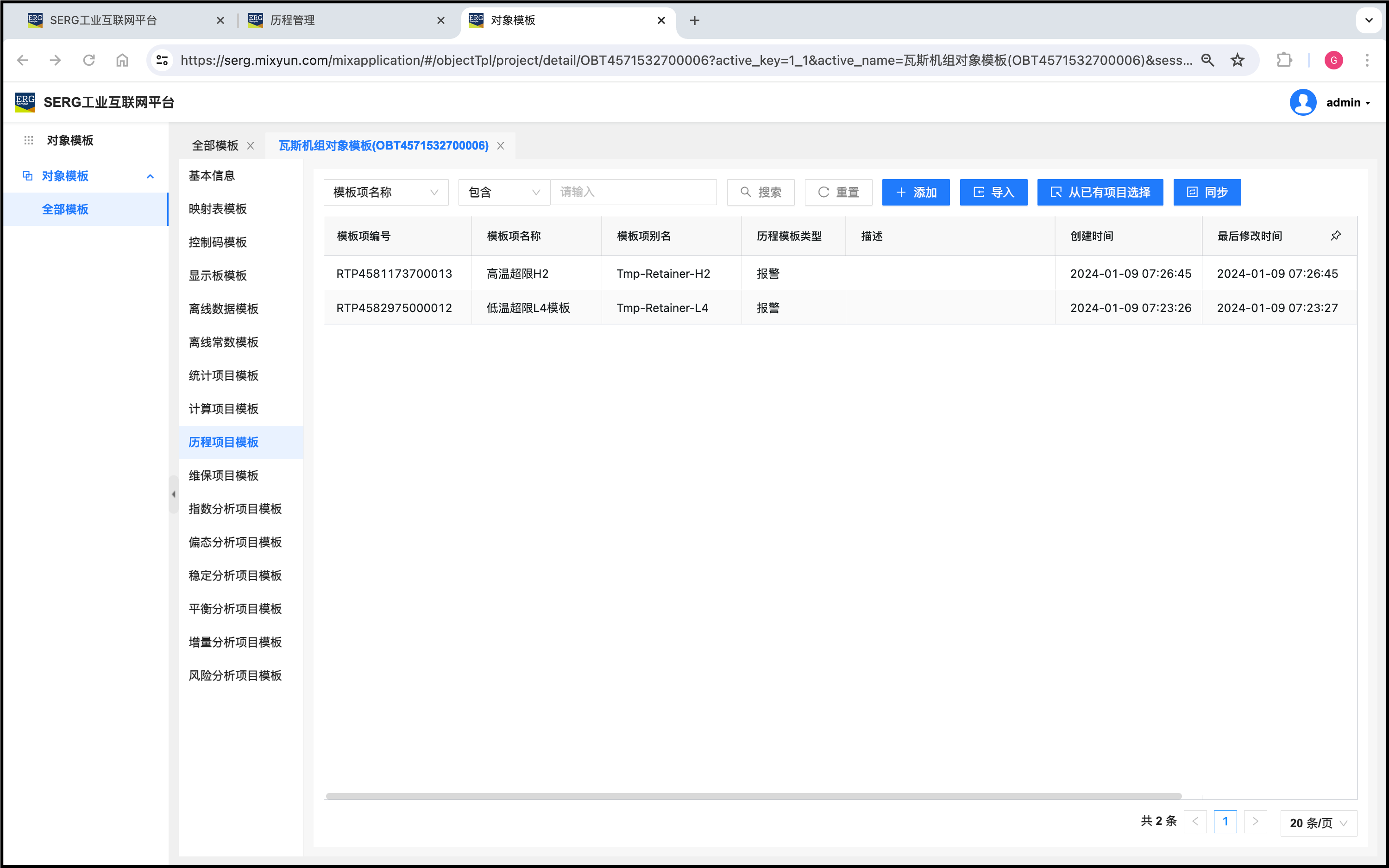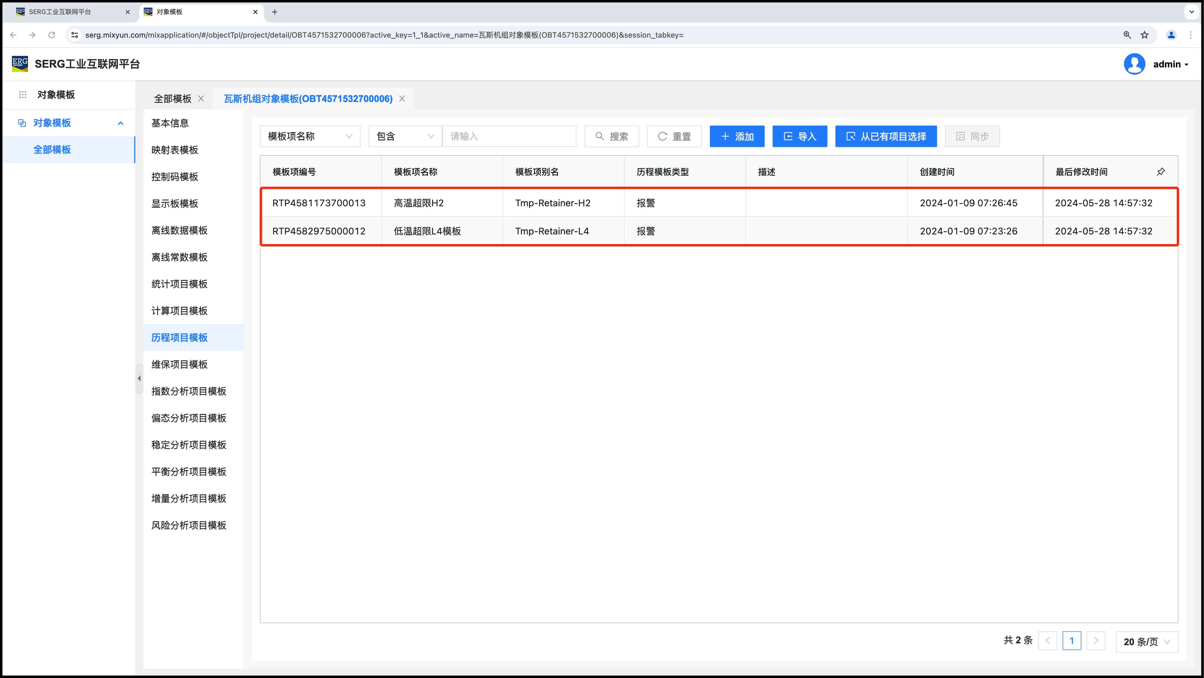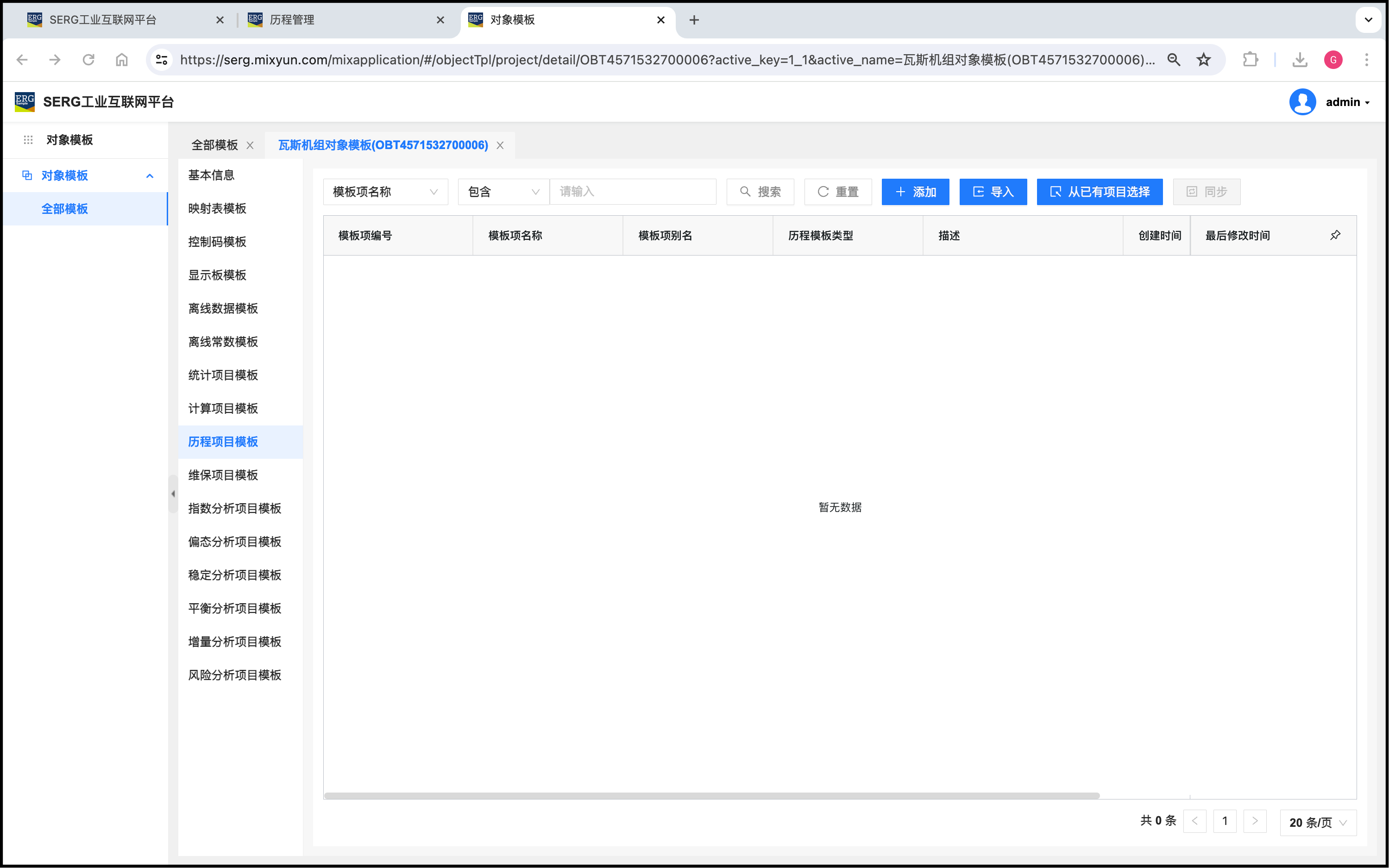 这个对象模板中,现在已经有三个模板项,分别是“映射表模板项(单)”和“控制码模板项(单)”以及“历程模板项(两个)”。