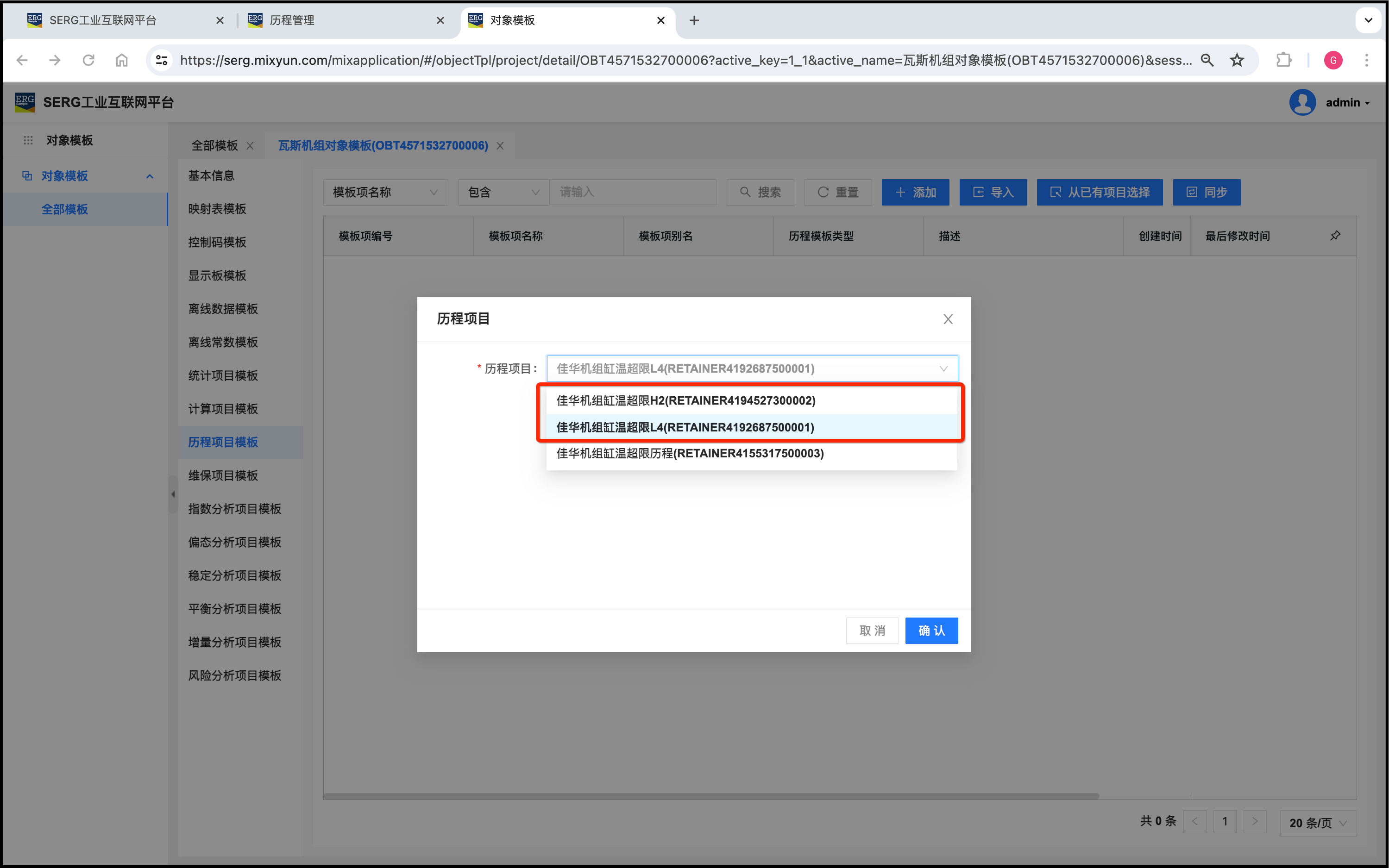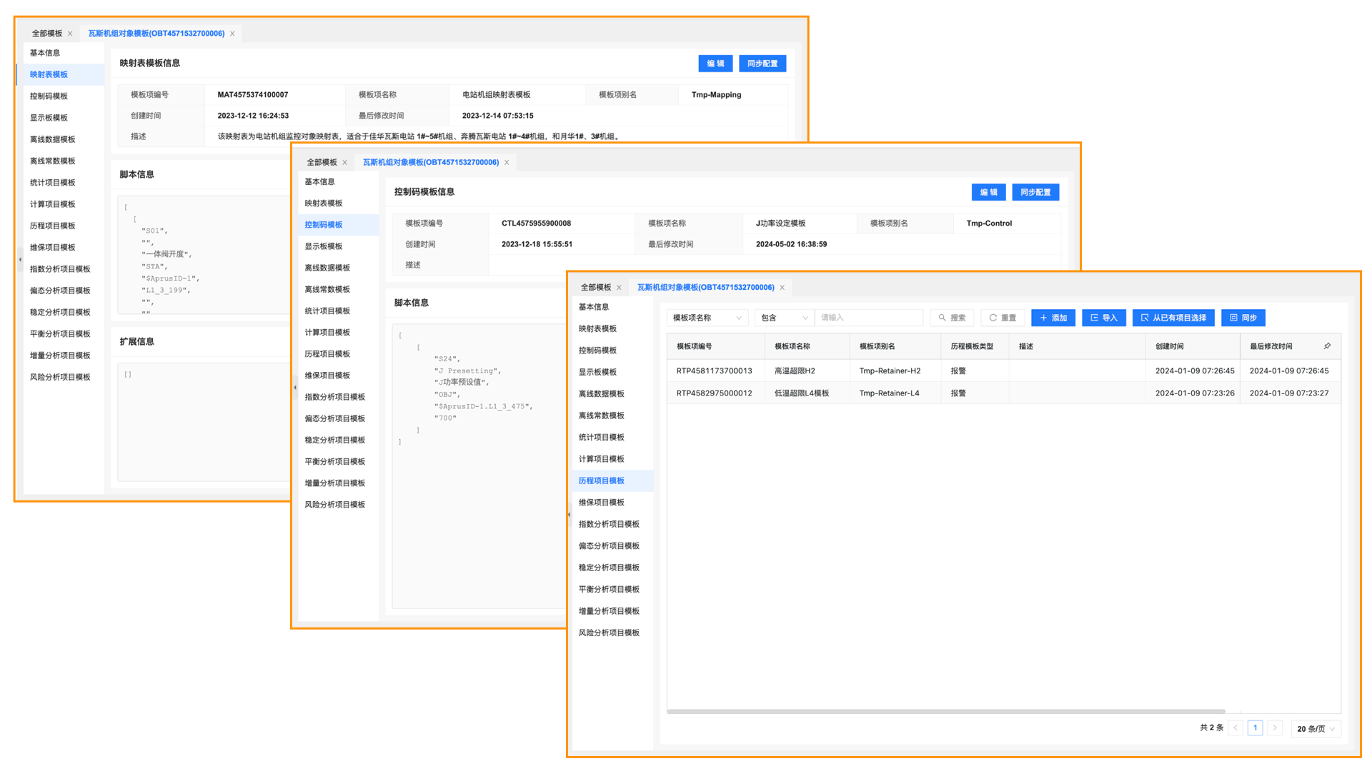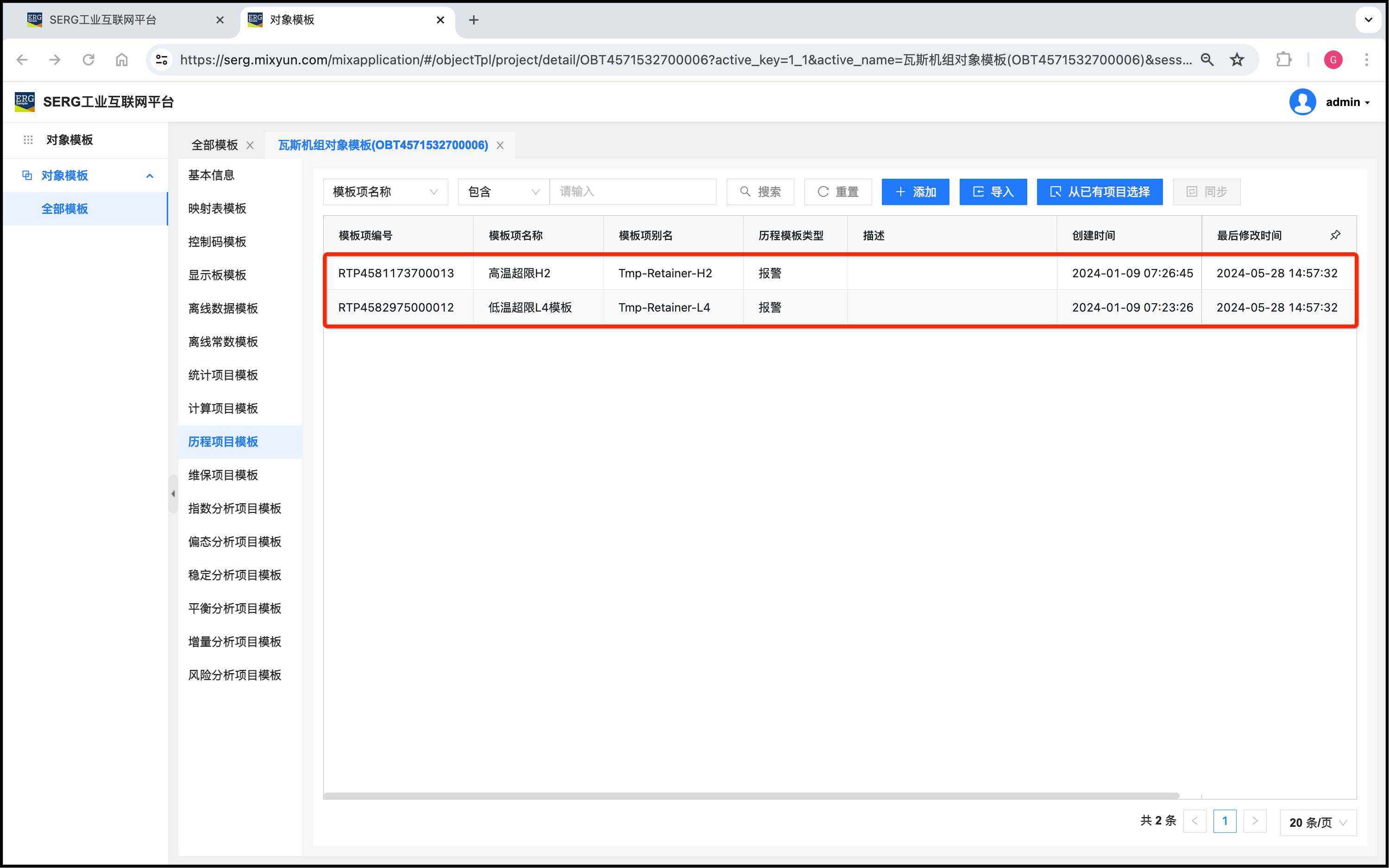 这个对象模板中,现在已经有三个模板项,分别是“映射表模板项(单)”和“控制码模板项(单)”以及“历程模板项(两个)”。
