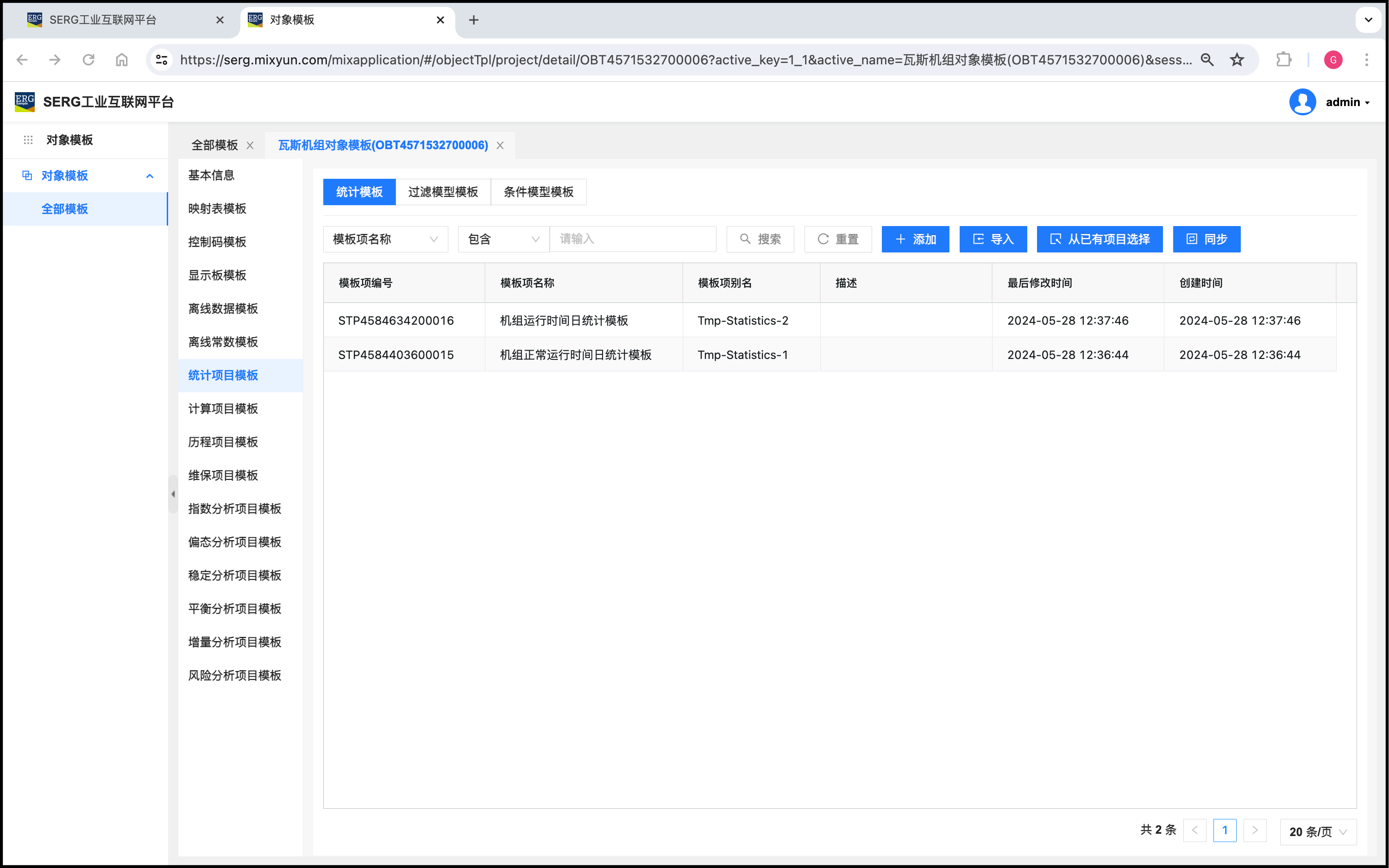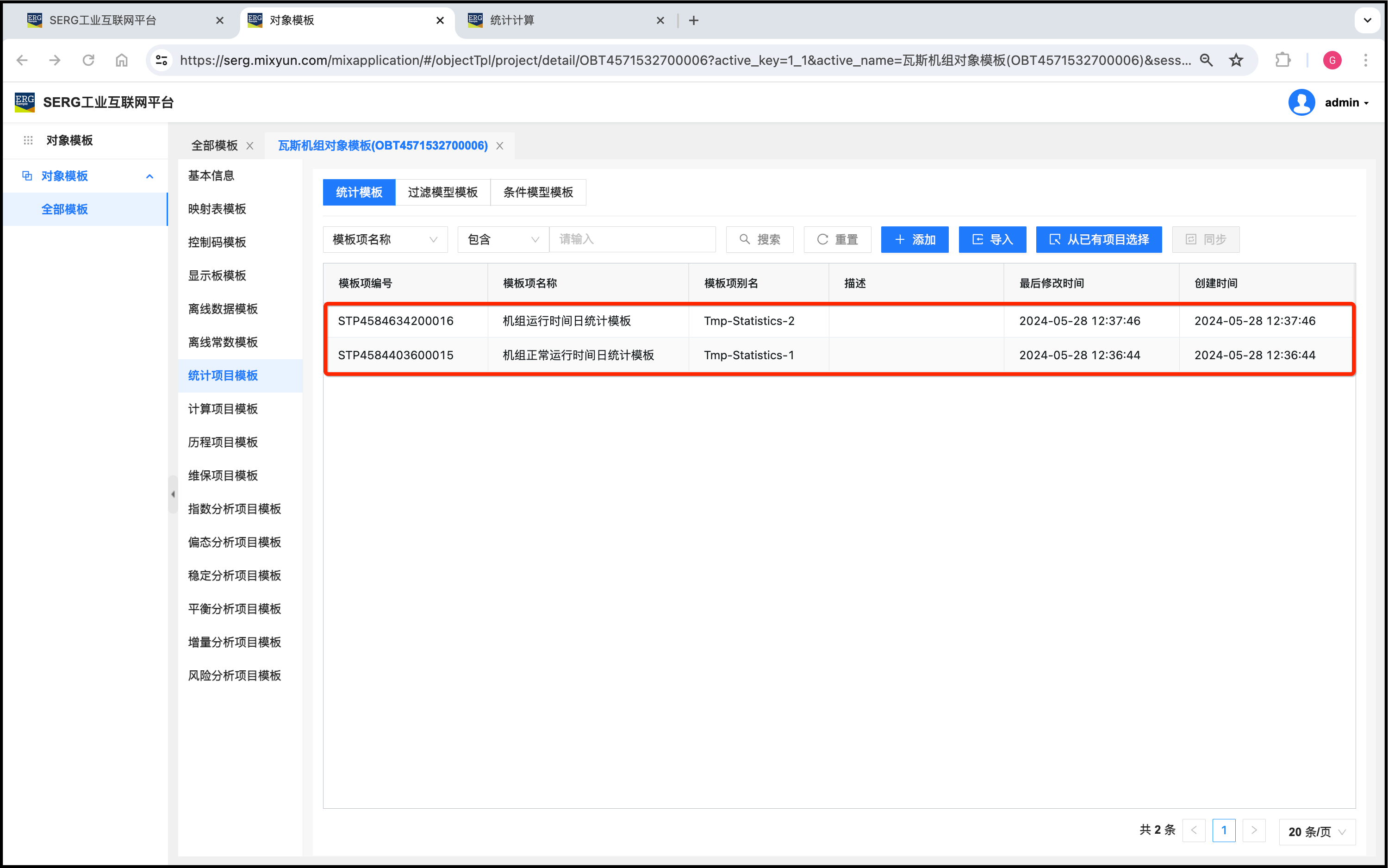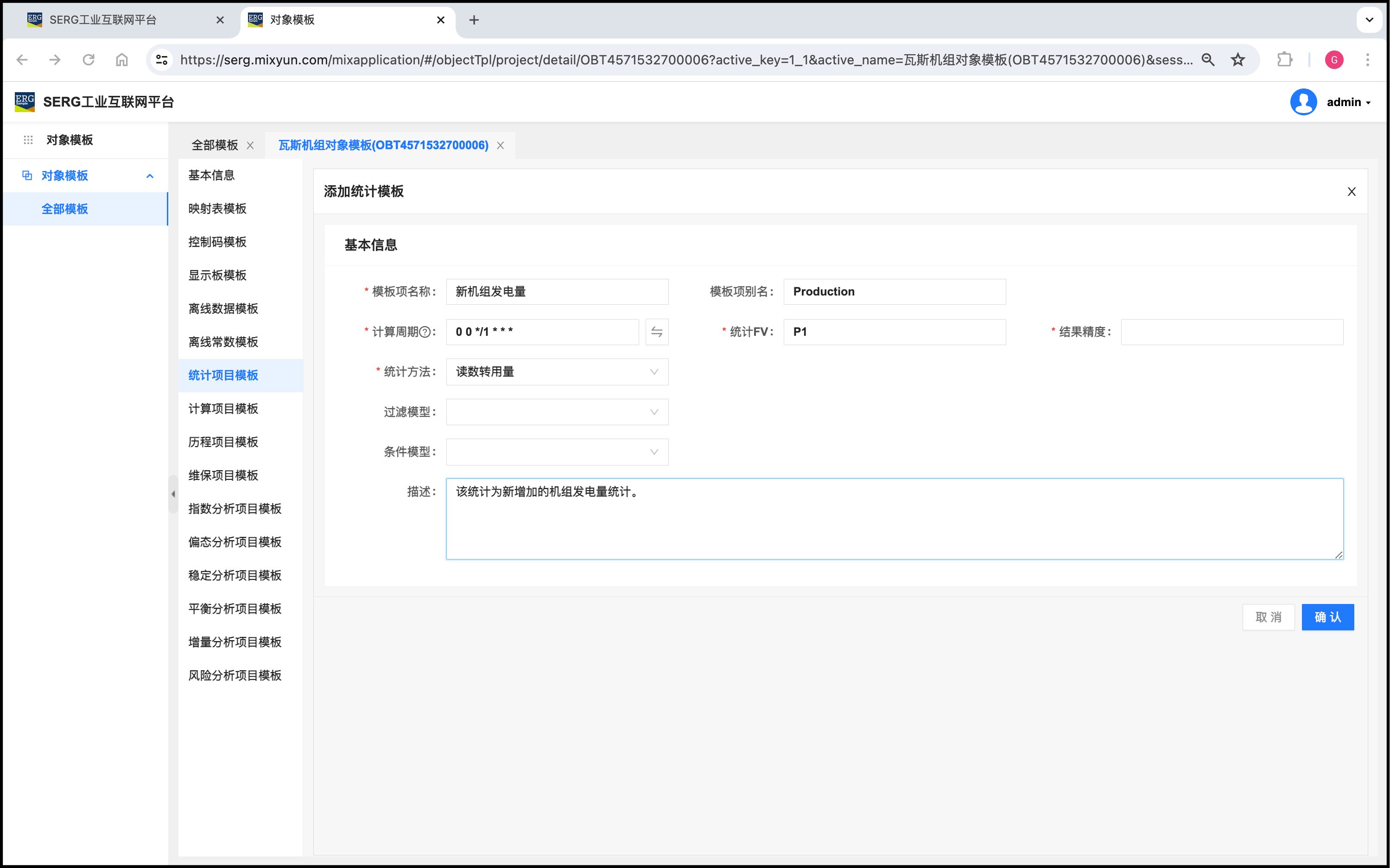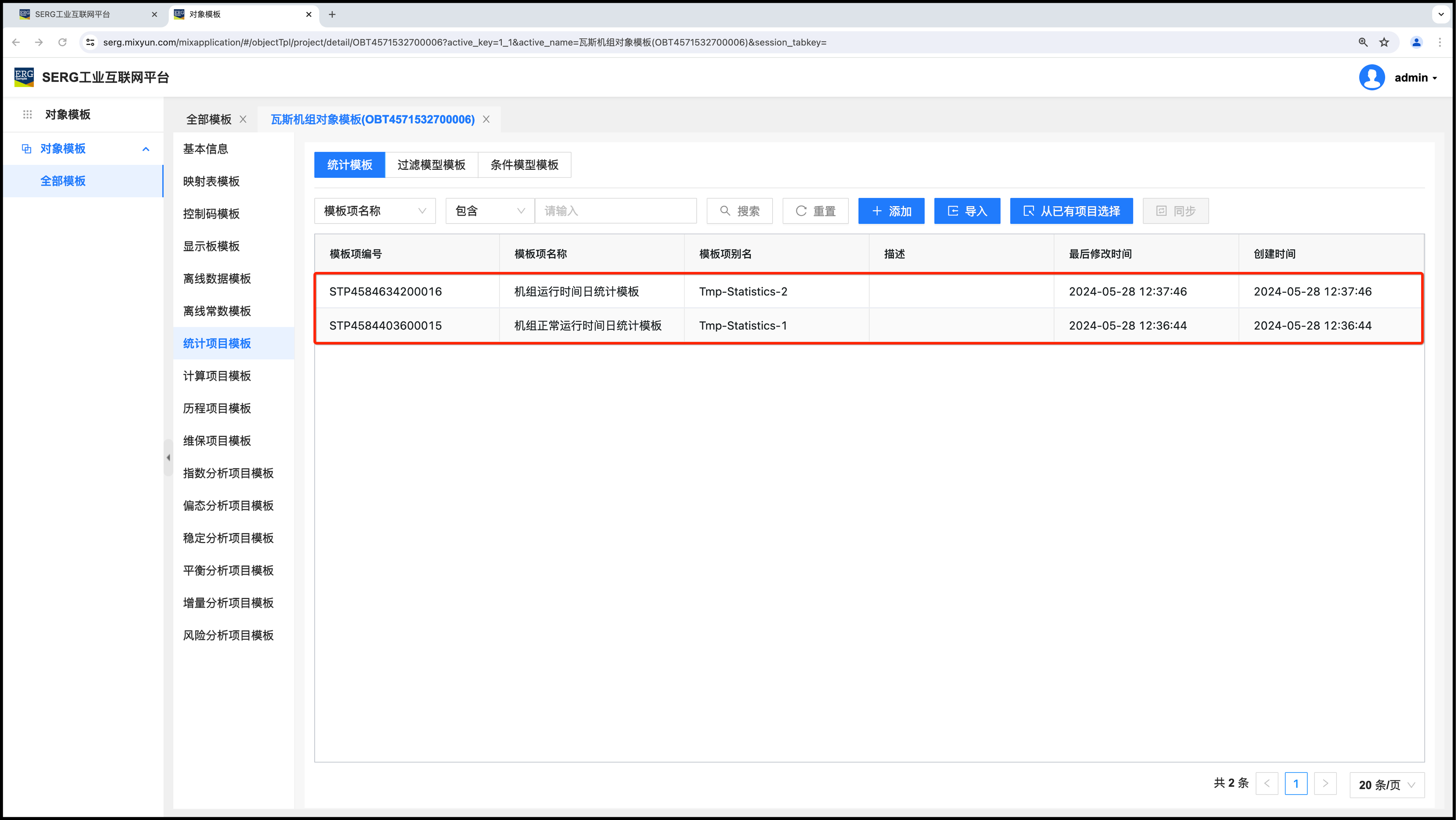 SERG现有的统计项目,在运营中都发挥着重要的作用,我们从中选择了2个机组的日统计项目进入这个对象模板的模板项:
