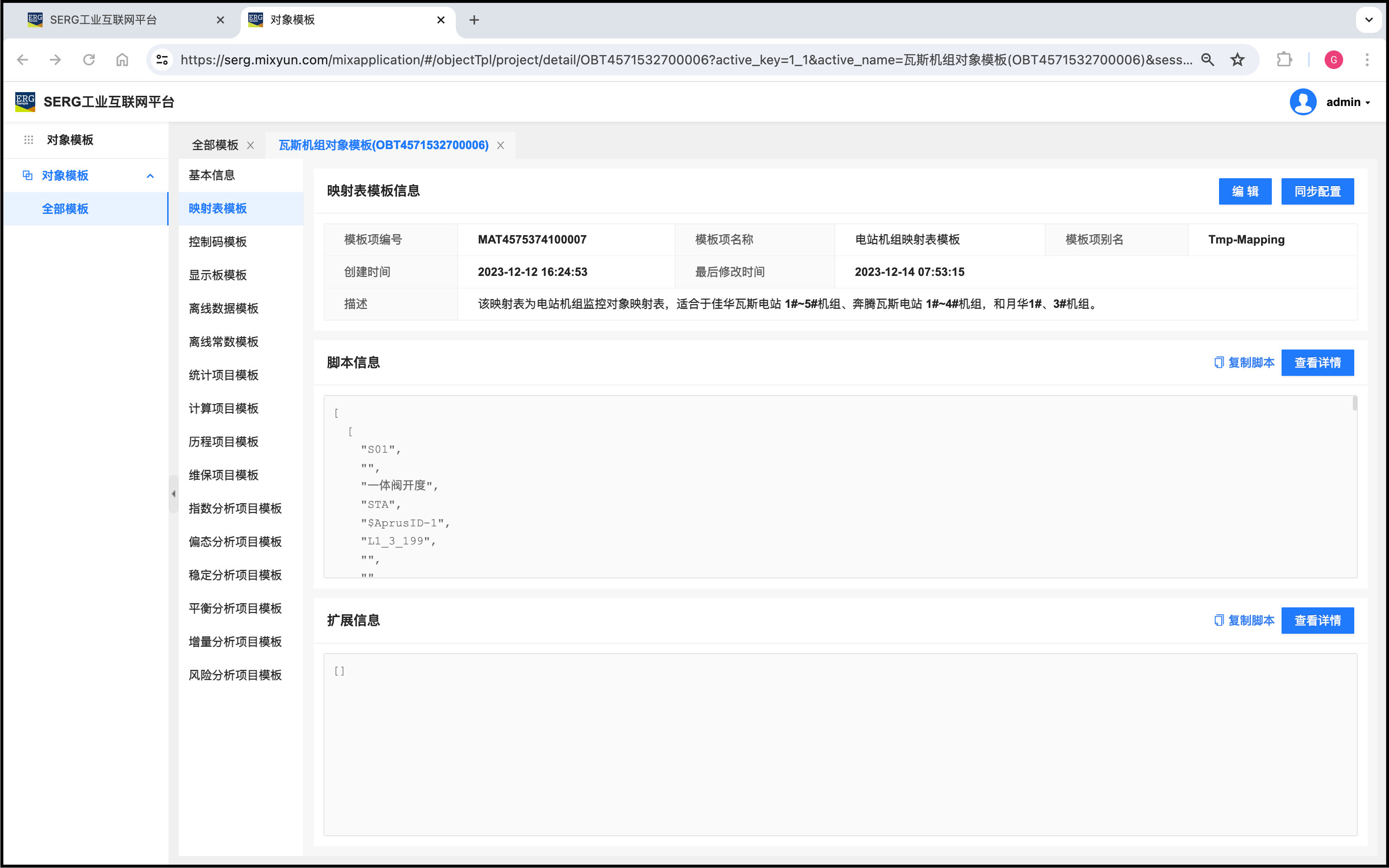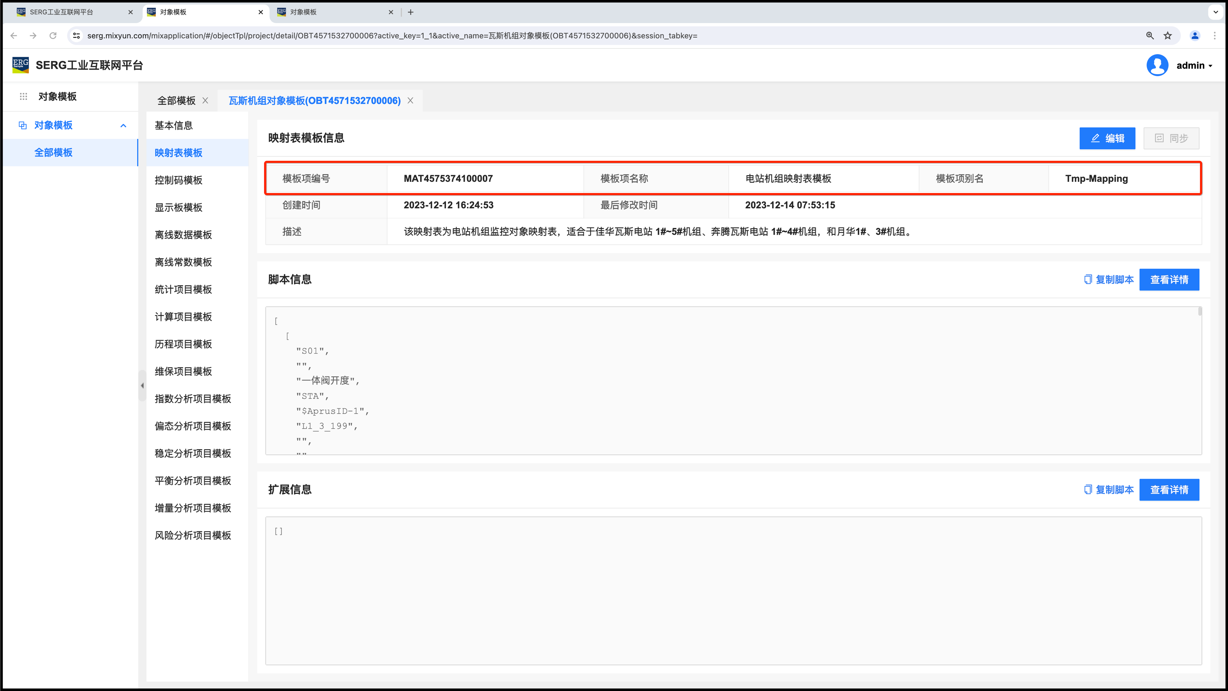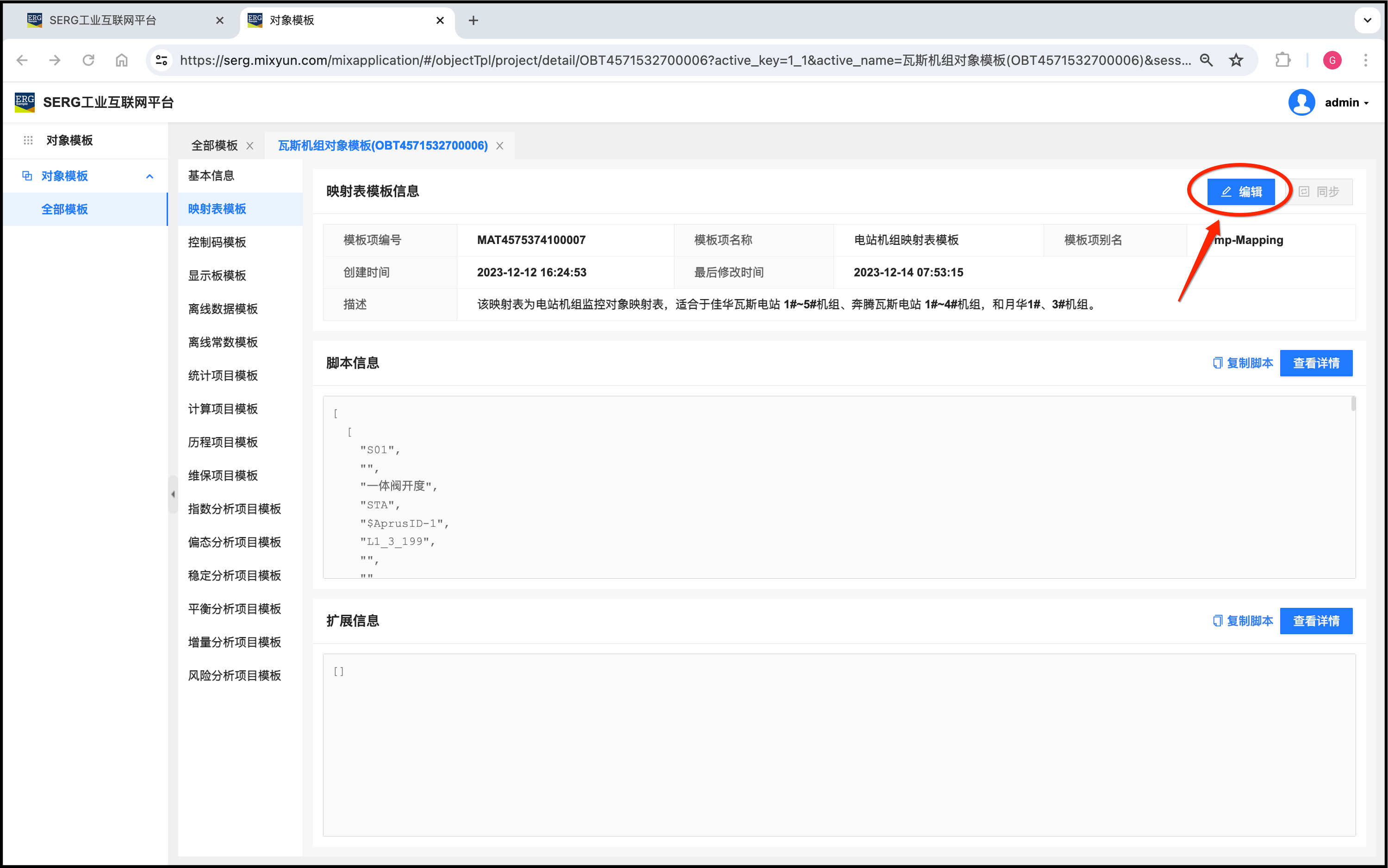当看到这个画面的时候,说明映射表模板项已经成了。可以点击 “编辑” 修改这个映射表模板项的属性或映射表脚本。