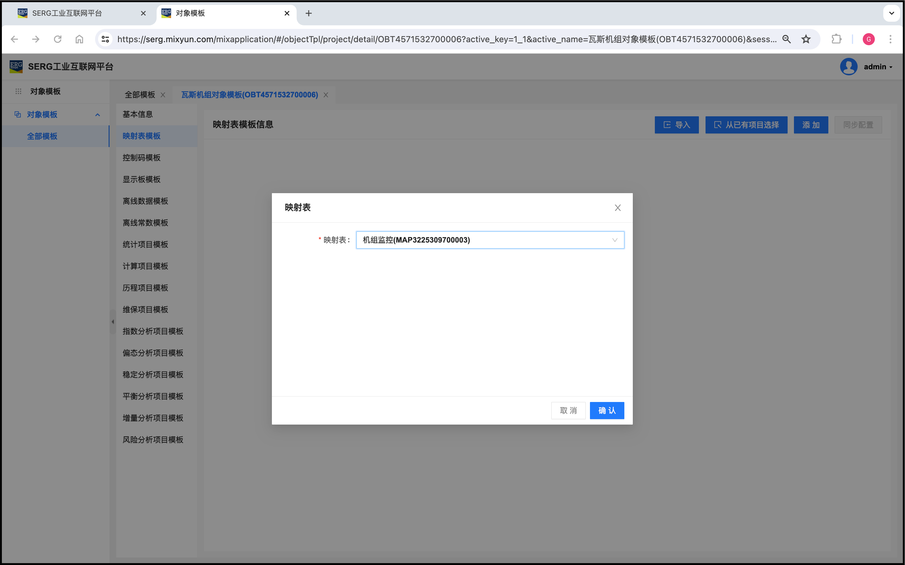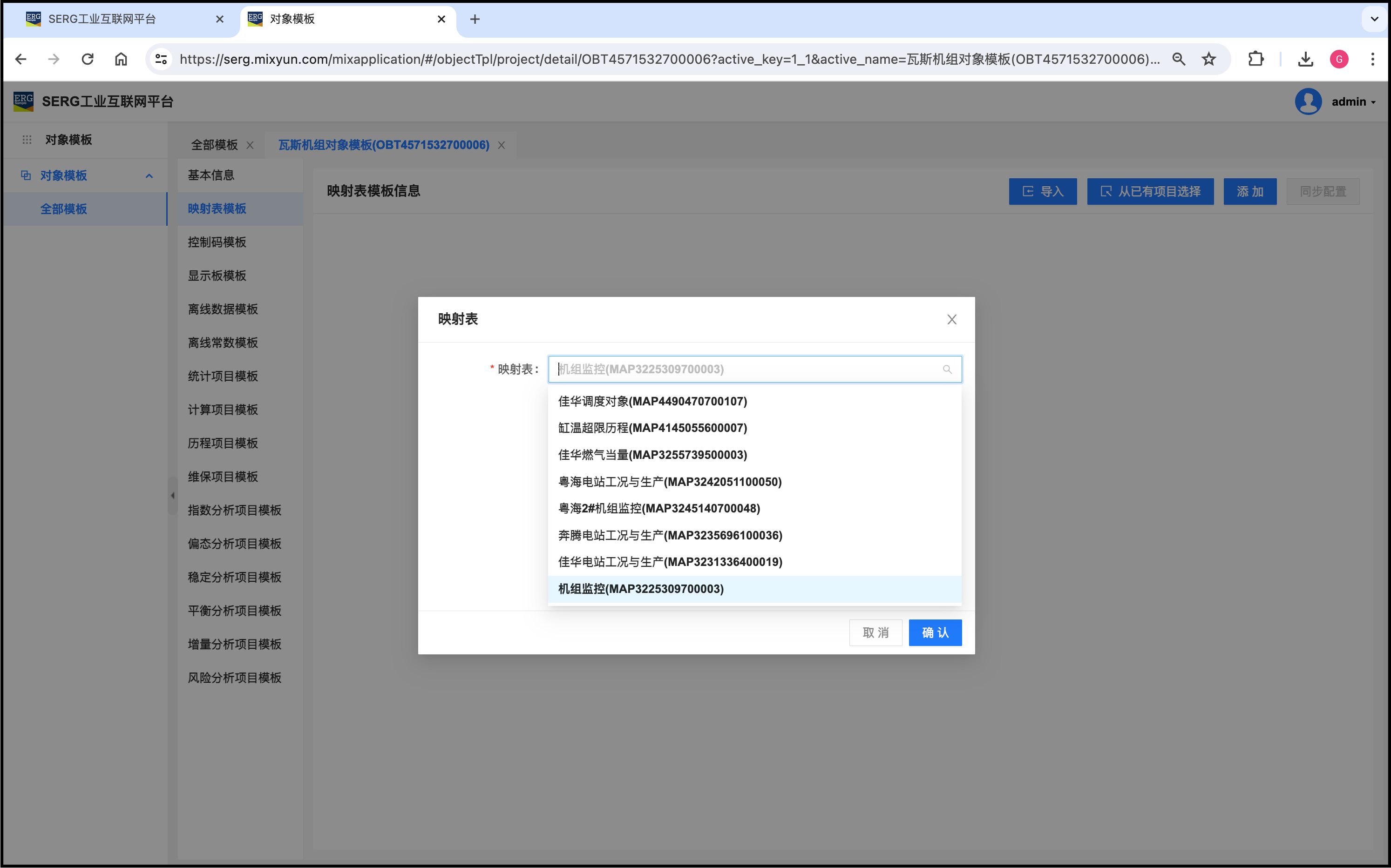 这里可以选择已经有的映射表项目作为该对象模板的模板项: