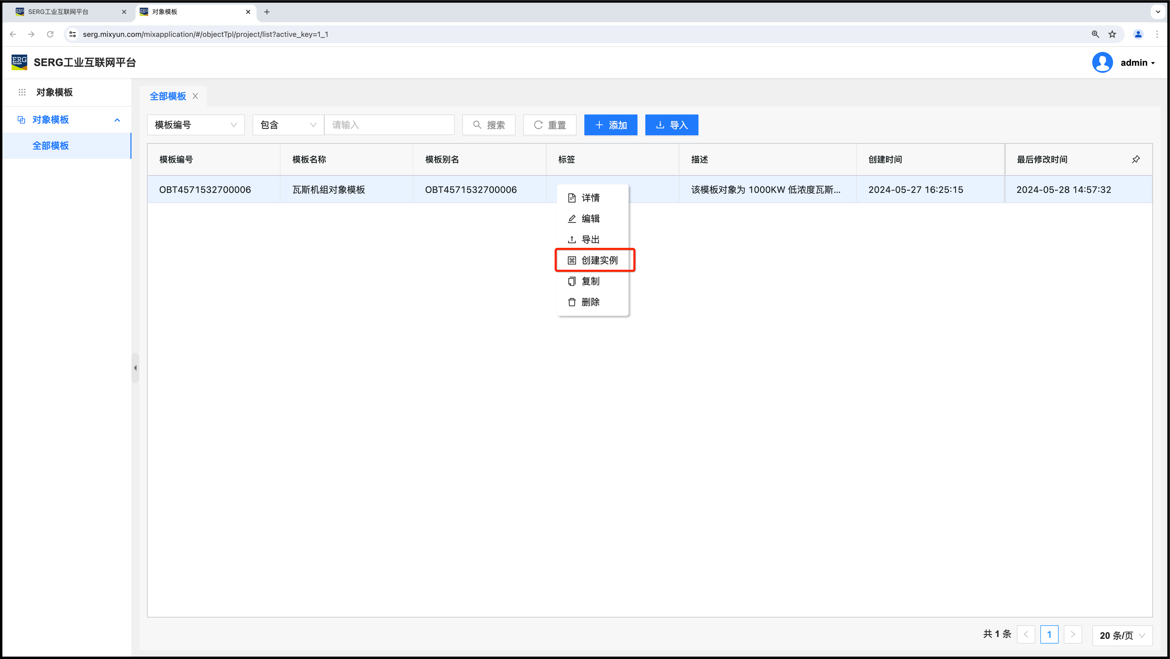 在完成了对象模板实例的创建工作后,“创建实例” 的操作项变成了 “不可用”。
