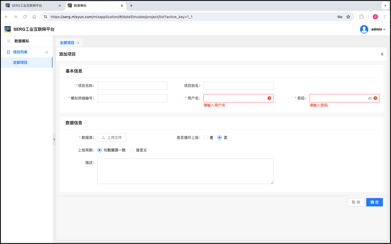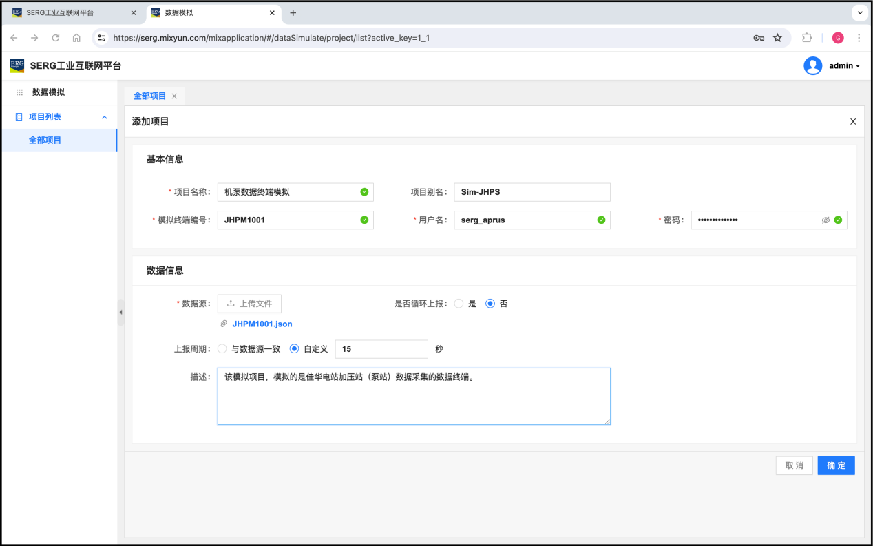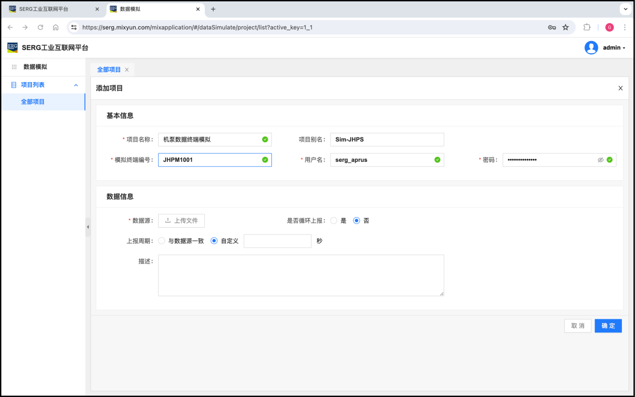 则需要填写上报周期,单位是 “秒”。这时候模拟项目会忽略数据源的时间间隔,按照这个数据源的顺序,根据设置上报周期的时间间隔,把数据发送出去。