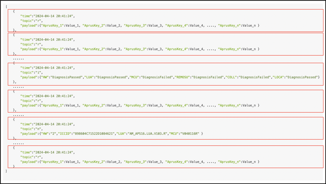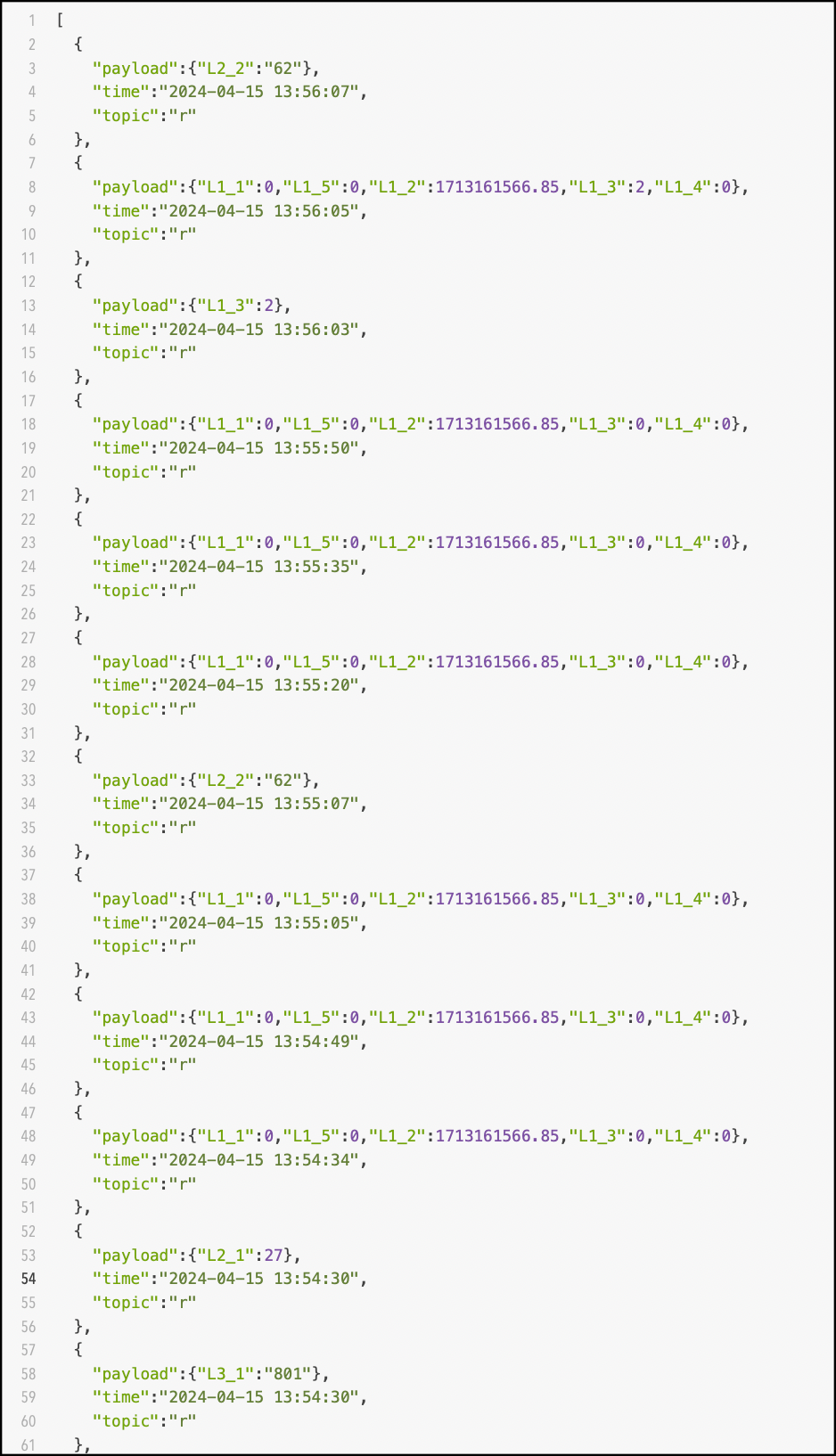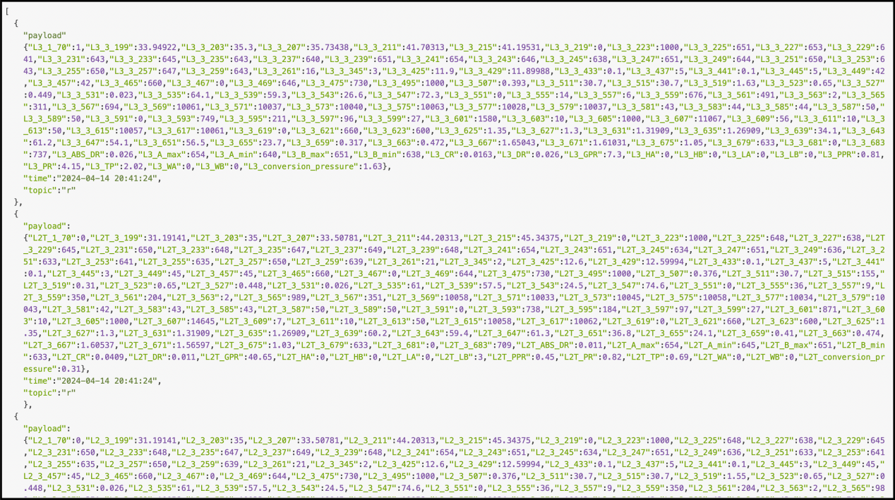 每条报文数据有三项内容,分别是:时间(time)、主题(topic)和有效数据载荷(payload)。