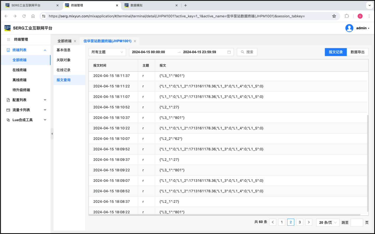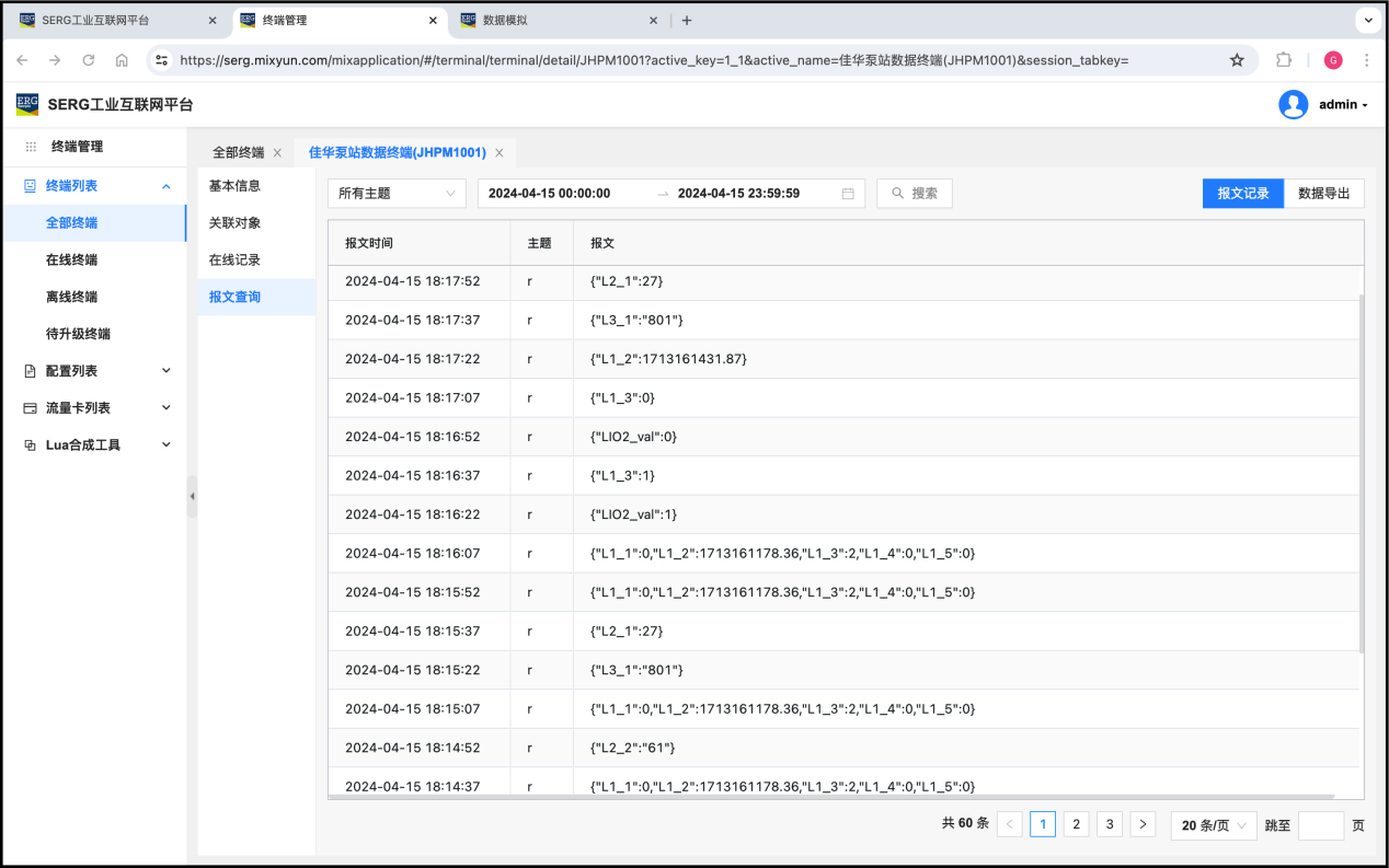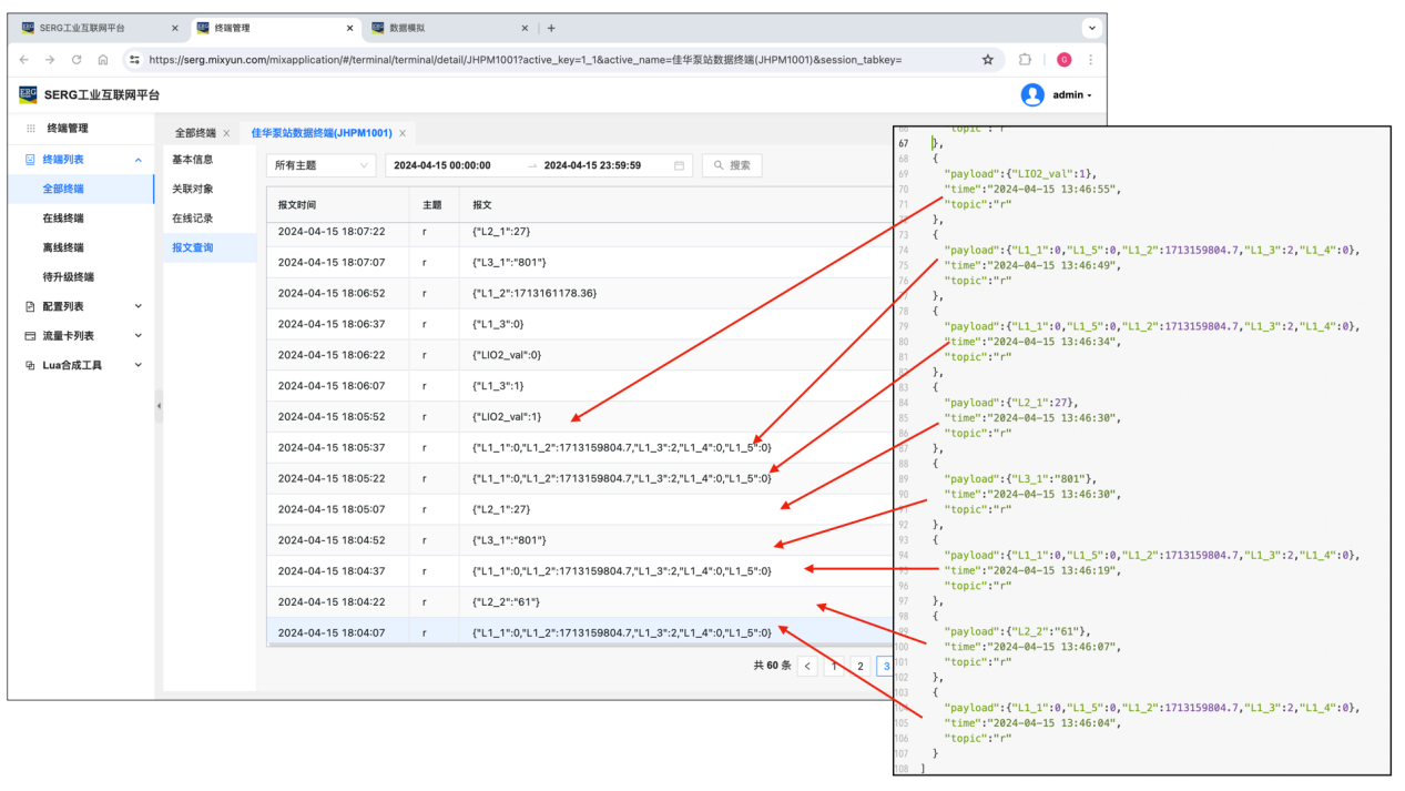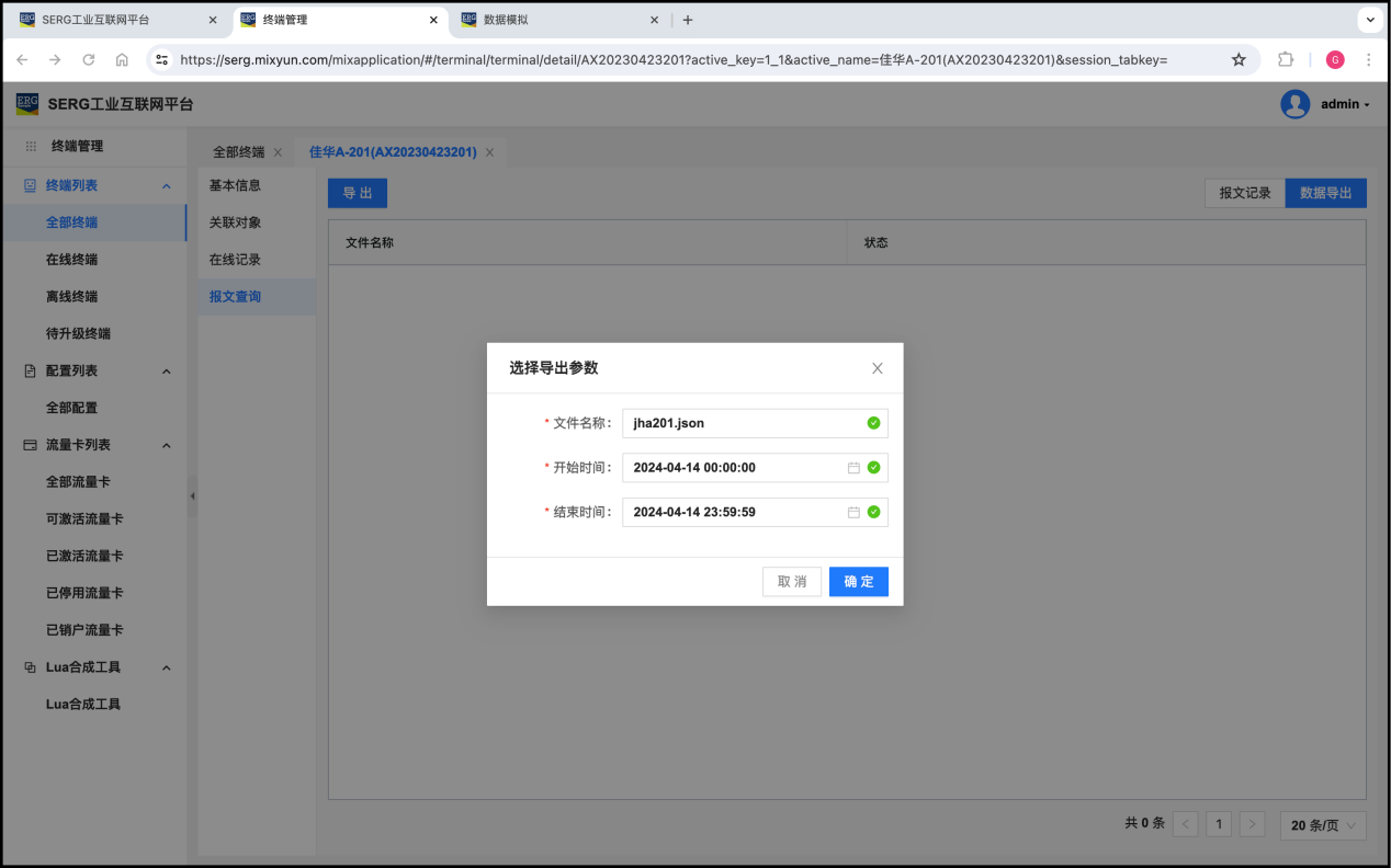 比如,我们可以在 “终端管理” 的终端详情中,把佳华电站的A-201数据终端,2024年4月14日这一天的全部报文数据导出到一个文件 jha201.json,这个导出的数据文件正好是符合模拟数据源格式的文件。