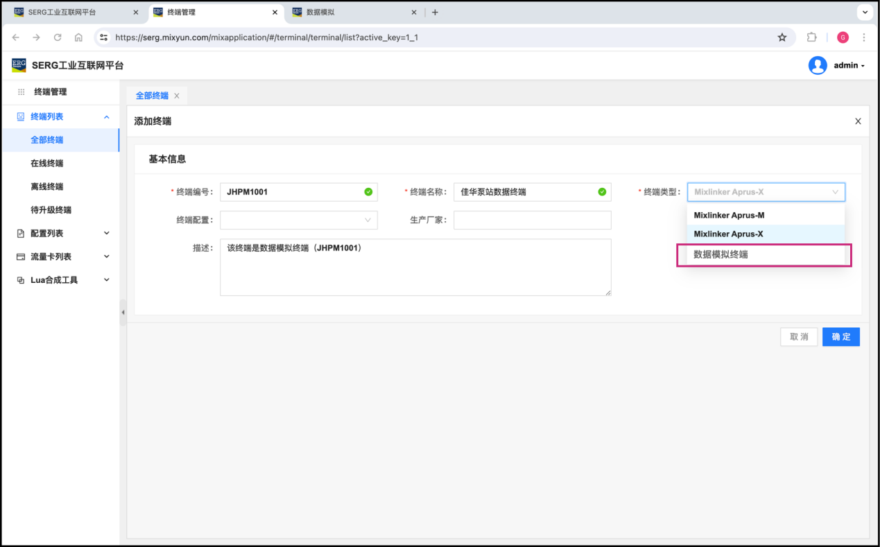 现在应该清楚,模拟数据只是替数据终端产生数据而已。这里面填写的 “模拟数据终端编号”,目前还不是真正的 MixIOT “数据终端”。所以,还需要在 “终端管理” 中去注册一个真实的终端: