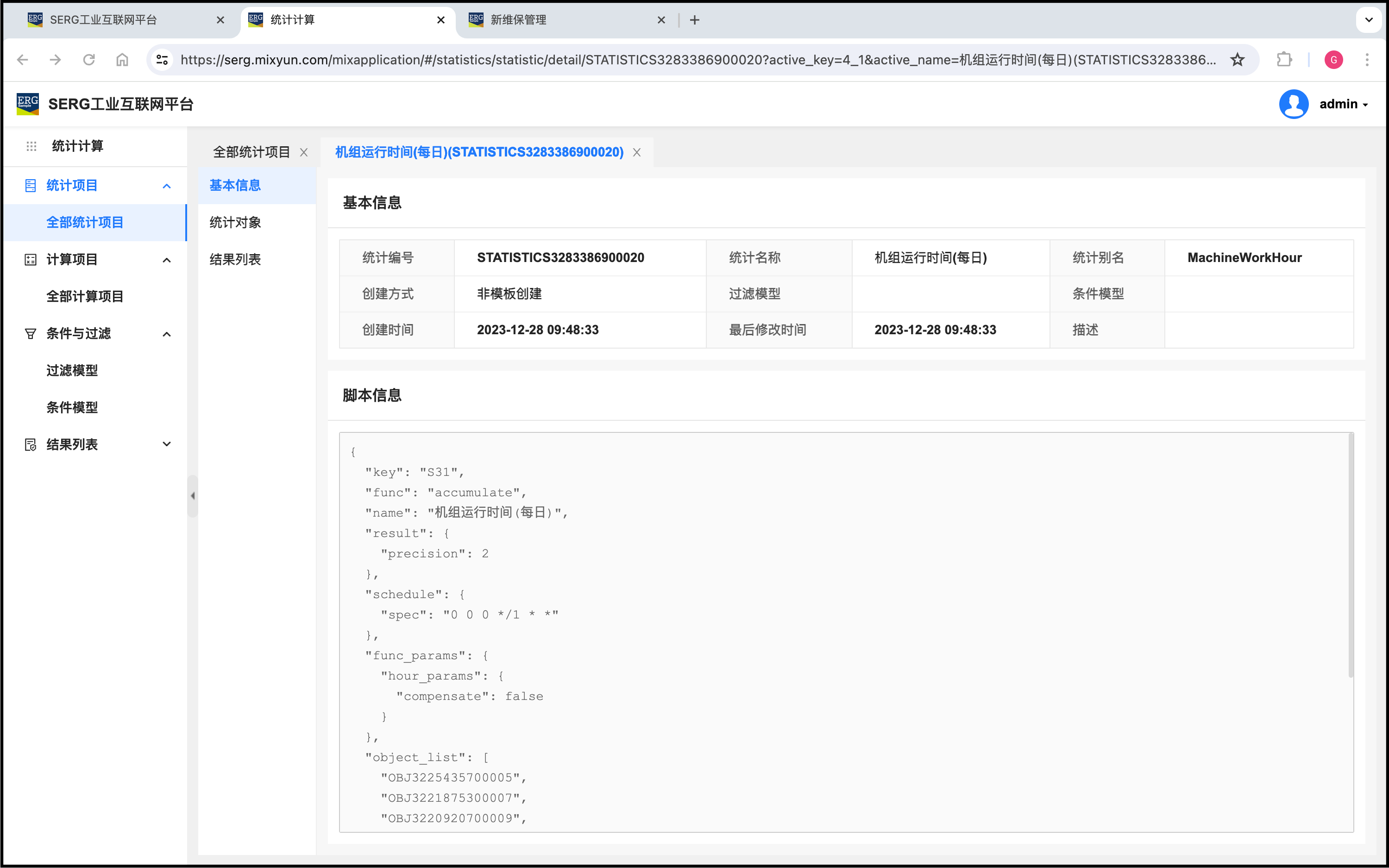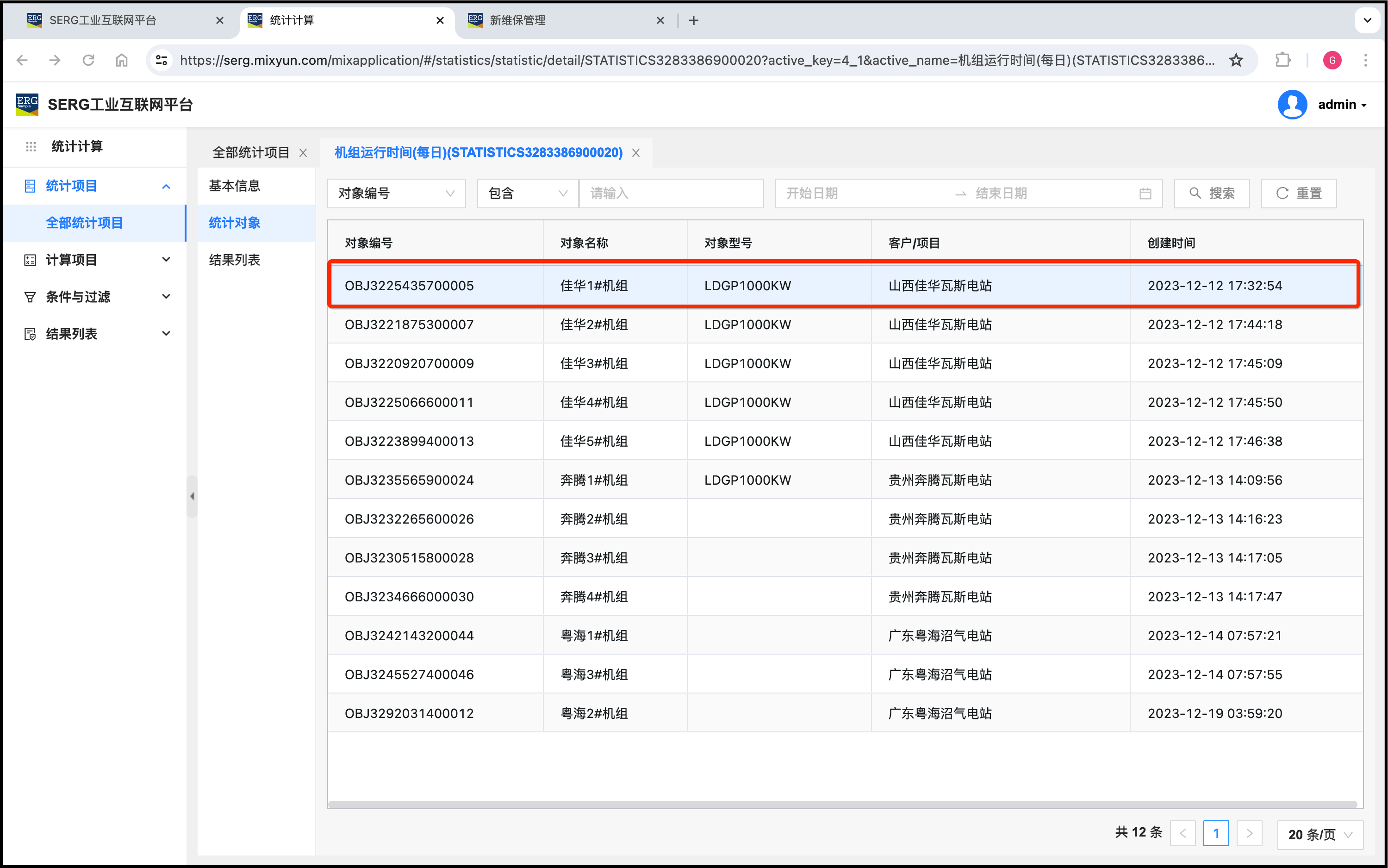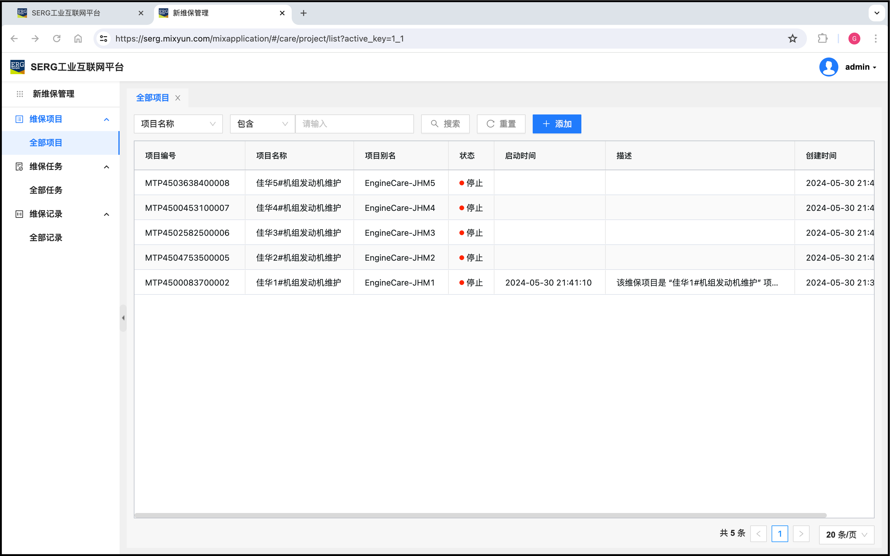 按照 MixIOT 维保项目规则,这5个对象中,只要有一个机组(对象)累计运行时间达到360小时,就会同时出来5个维保任务,这5个任务分别都对应一个机组。