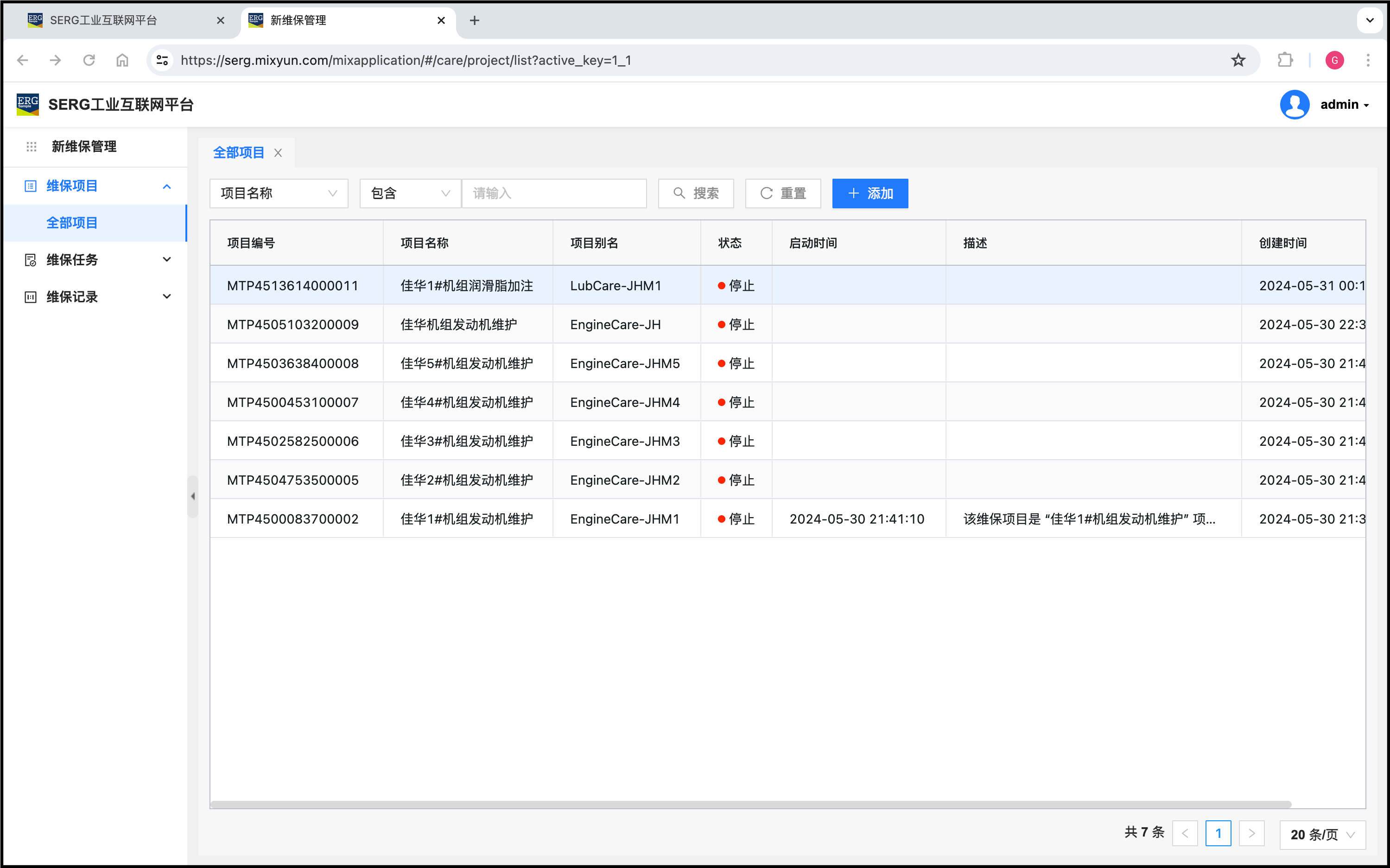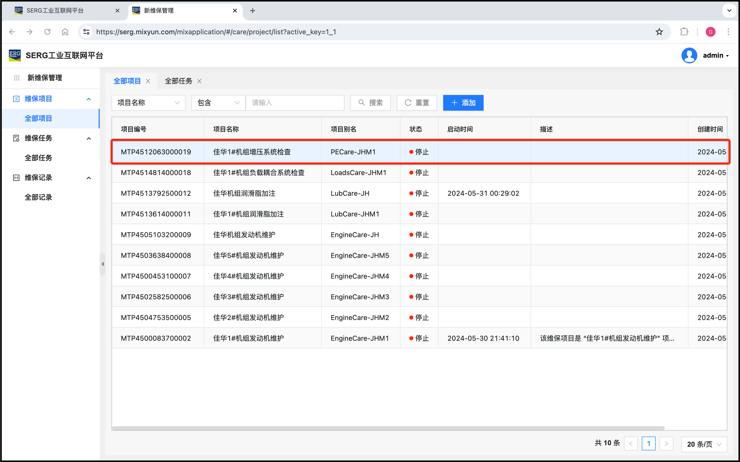 上面为佳华电站的机组一一分别创建了维保项目。这些维保项目是同时到期的,所以也可以这样来为佳华电站机组创建维保项目: