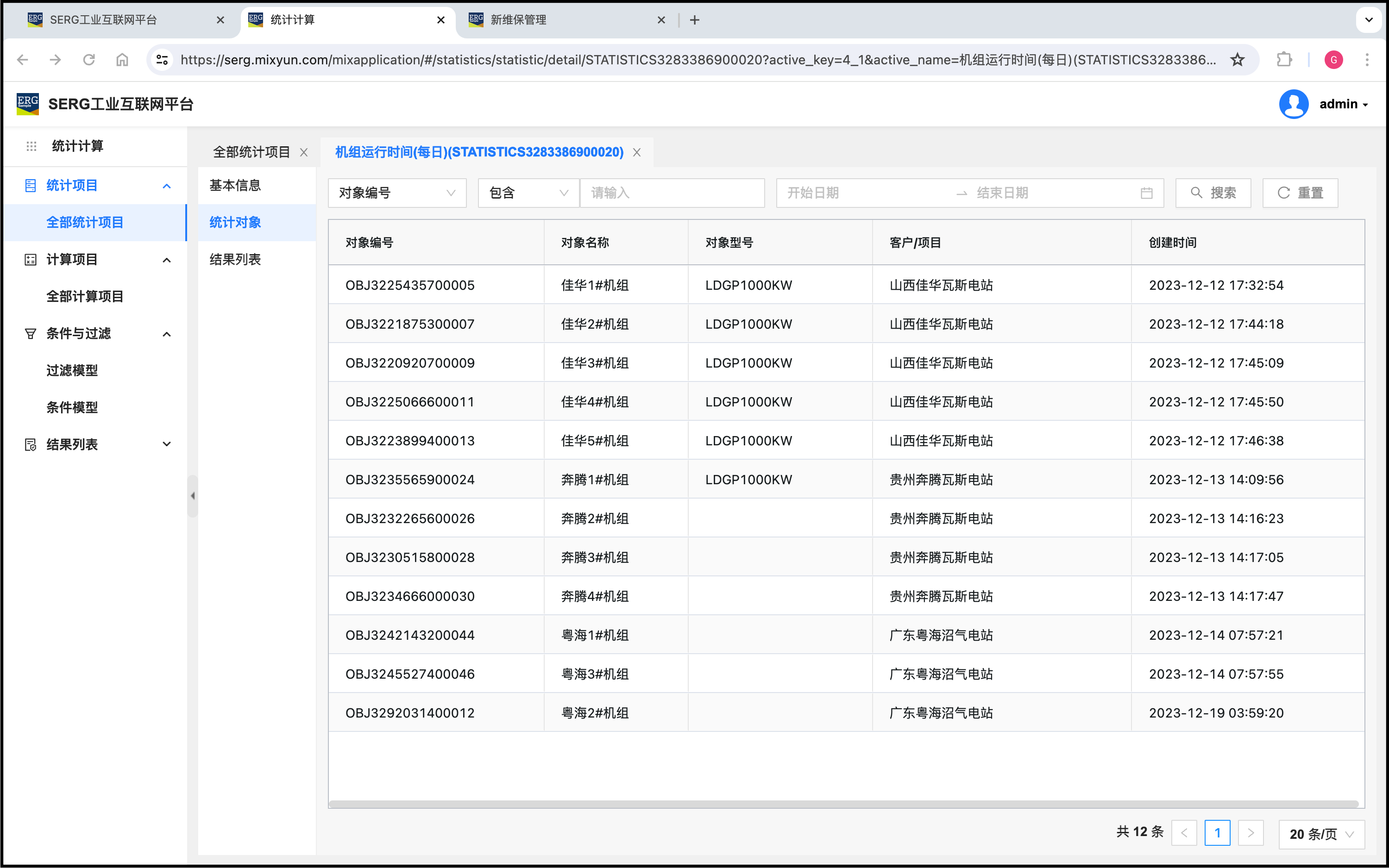 这个统计项目是一个 “日统计”,也就是说,这个统计每天出一个统计结果,这个结果就是这些机组对象每天运行的时长。