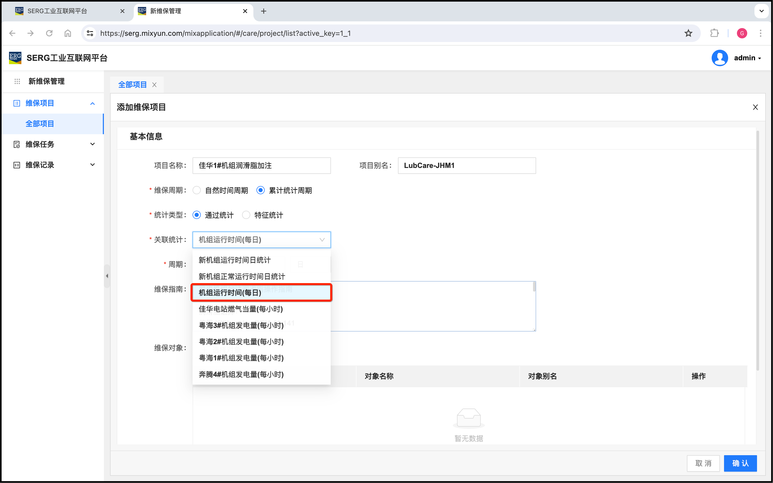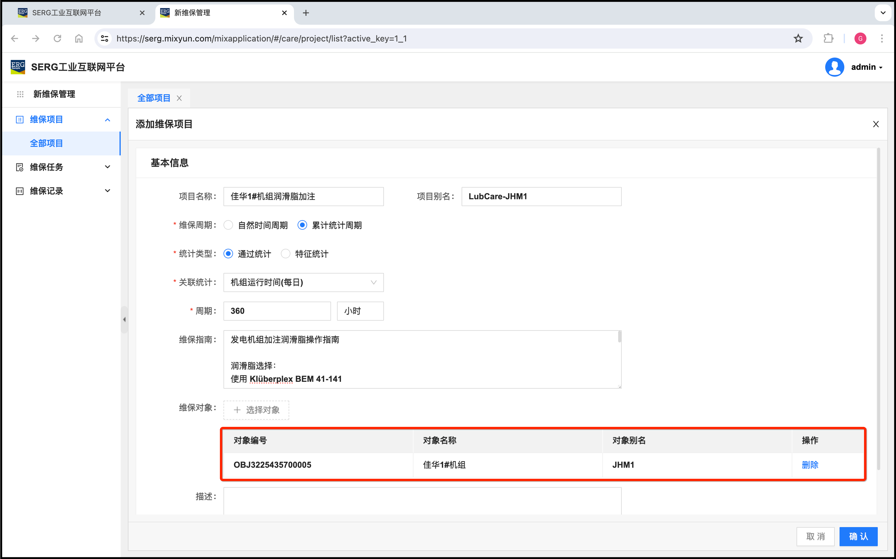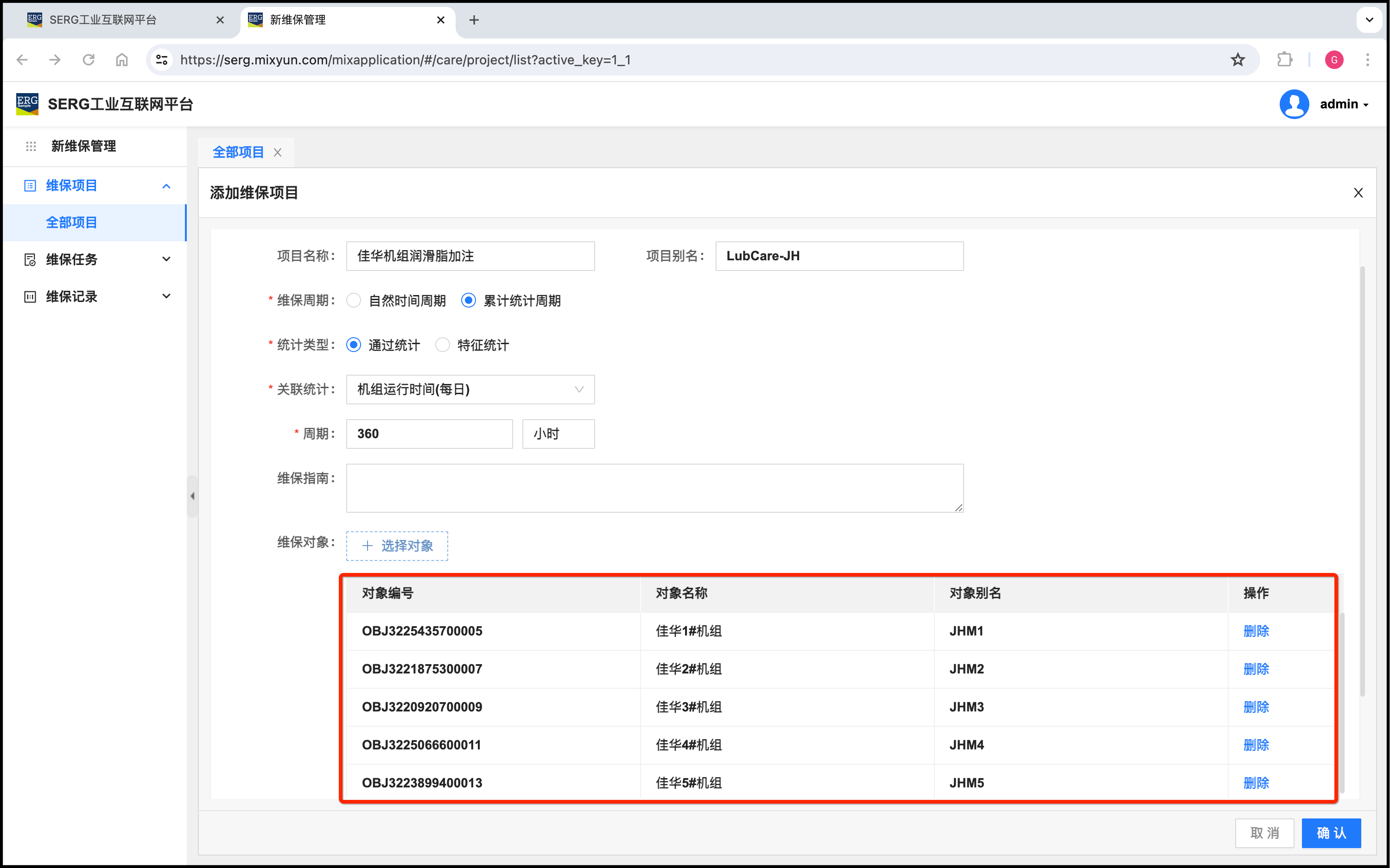 我们注意到,这个维保项目是佳华1#机组的周期性维保项目,对象当然只需要添加佳华1#机组对象。