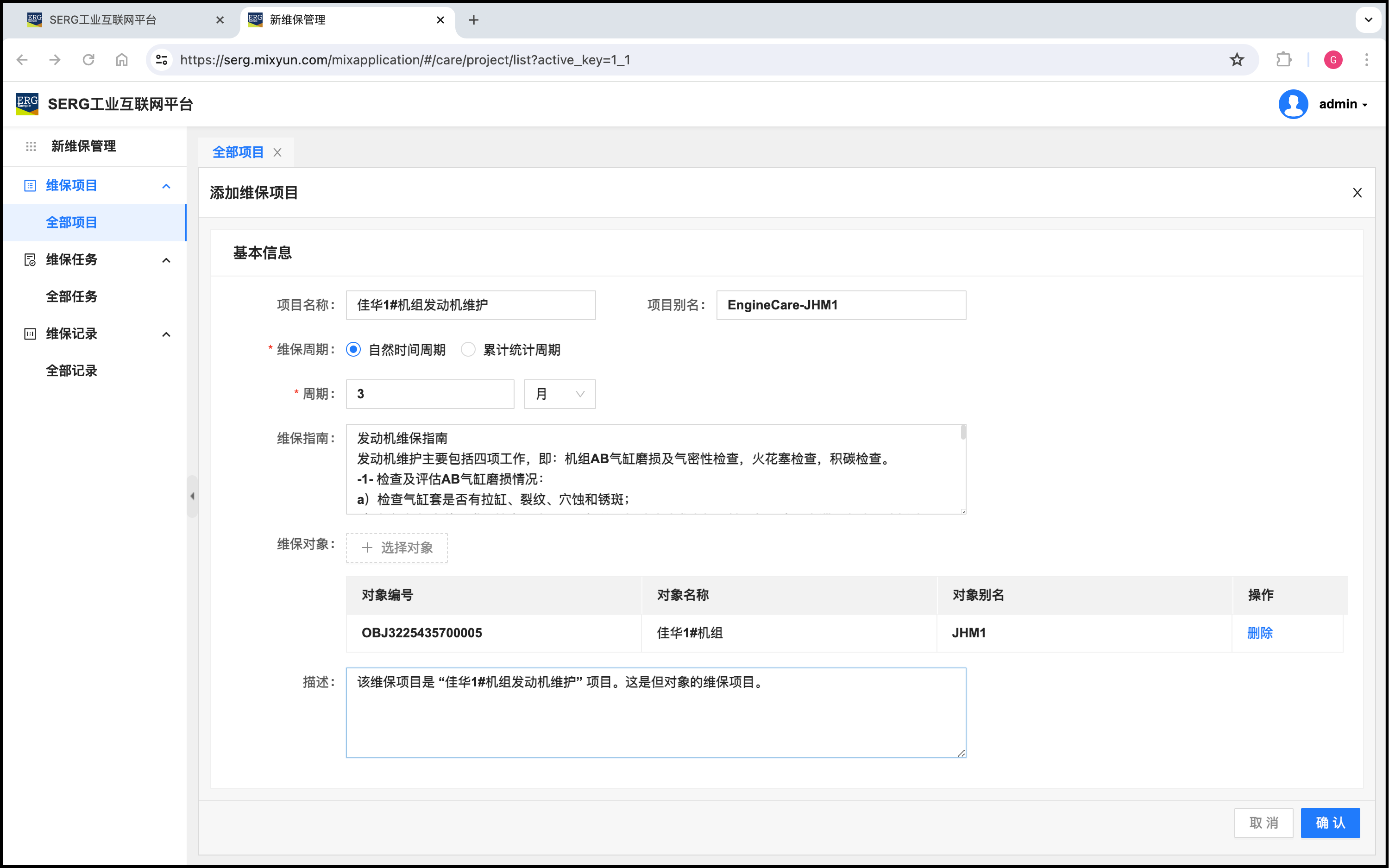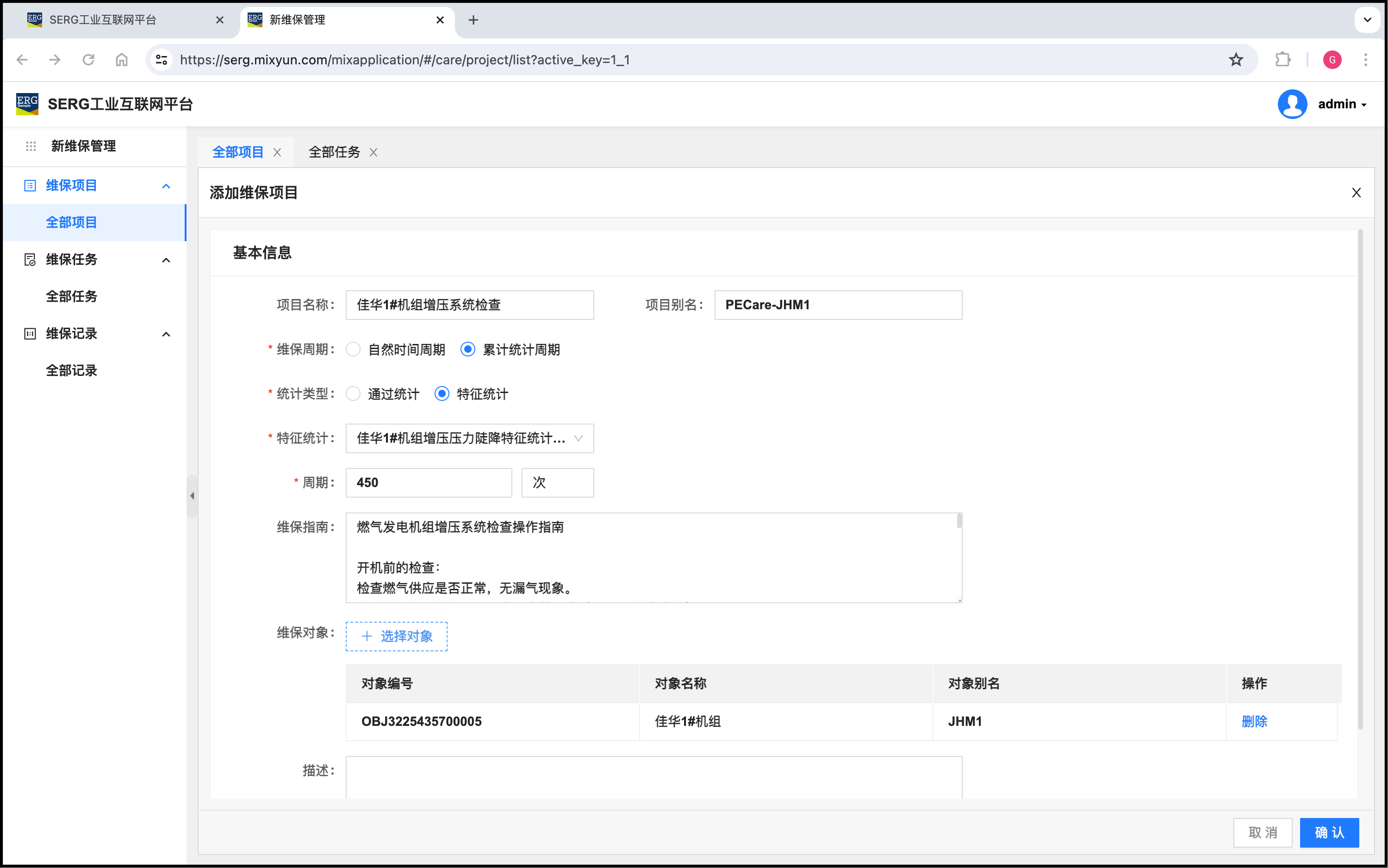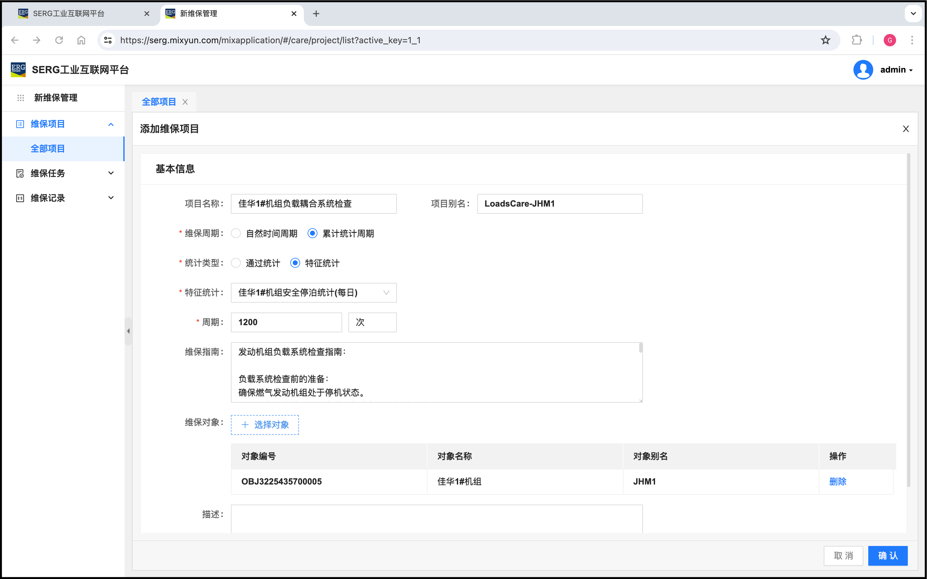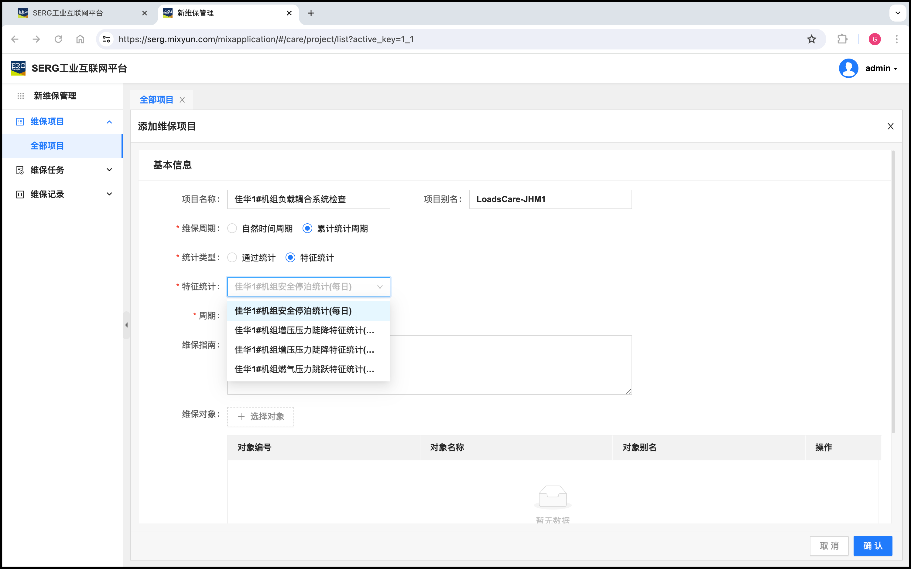 我们注意到,这个维保项目是佳华1#机组的周期性维保项目,对象当然只需要添加佳华1#机组对象。
