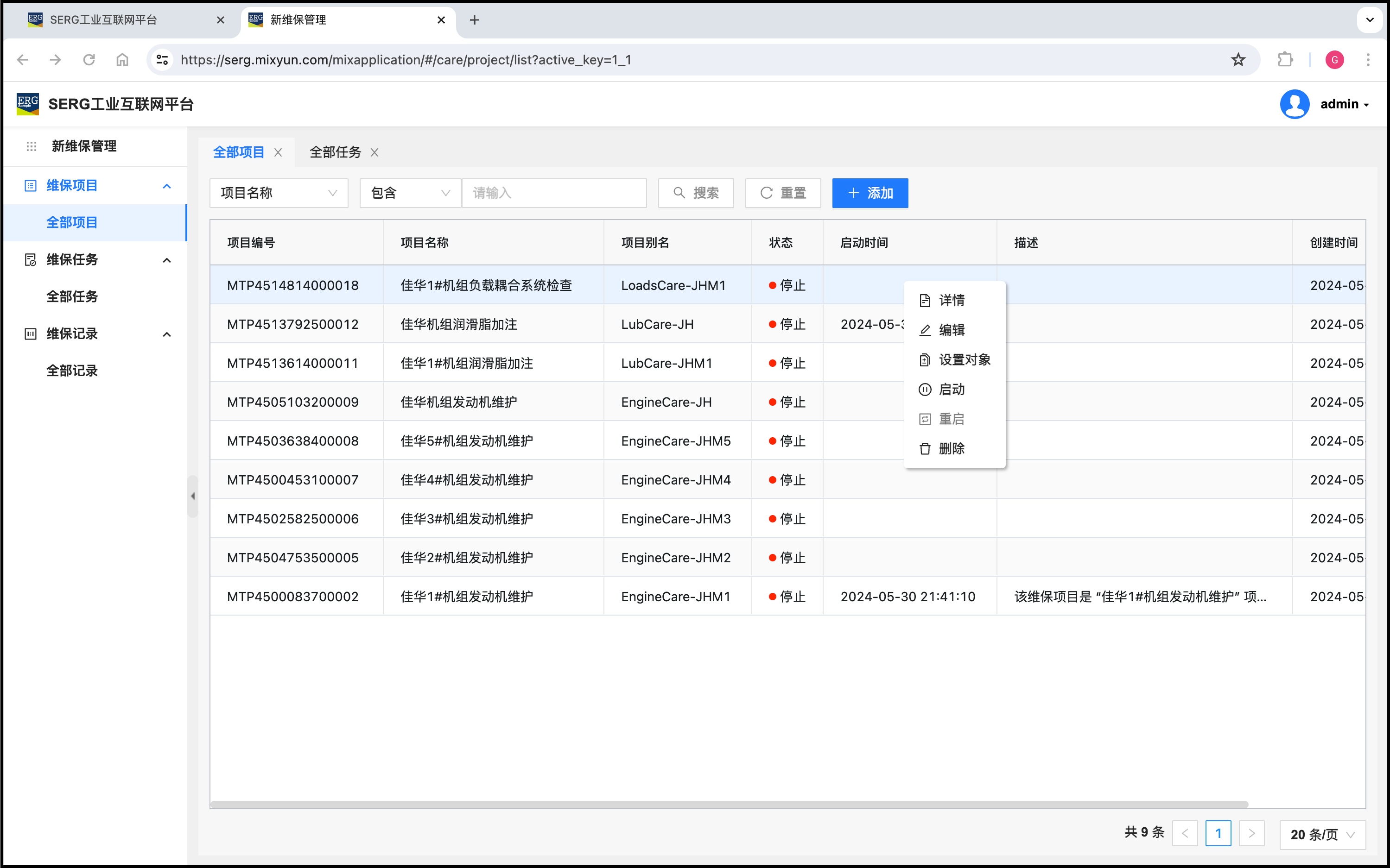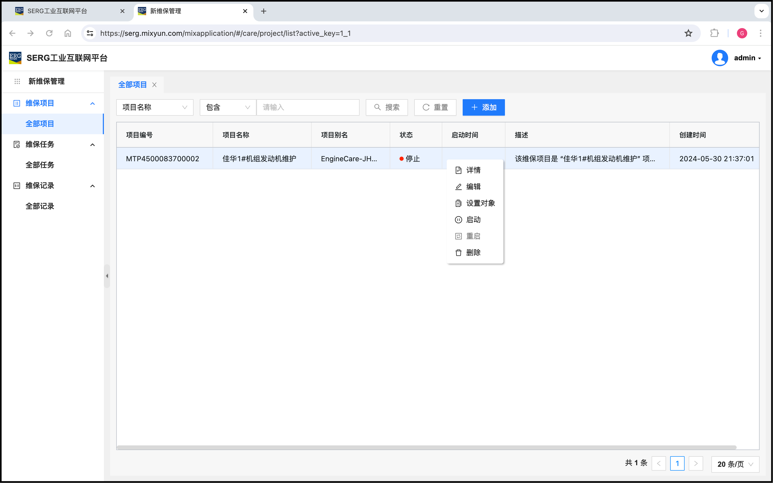创建的项目默认是停止的,随时可以 “启动” 这个维保项目。