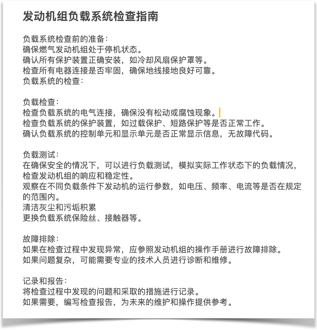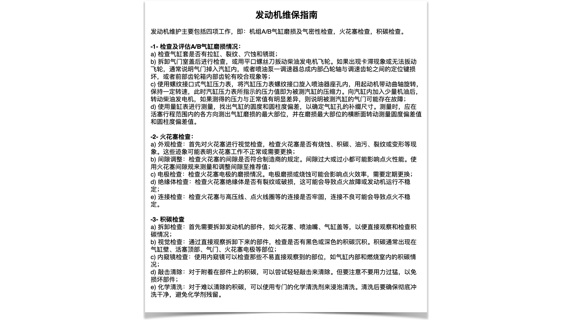 1 | 各机组 | 3个月 | 发动机维护: 机组A/B气缸磨损检查,气密性检查,火花塞检查,积碳检查 |