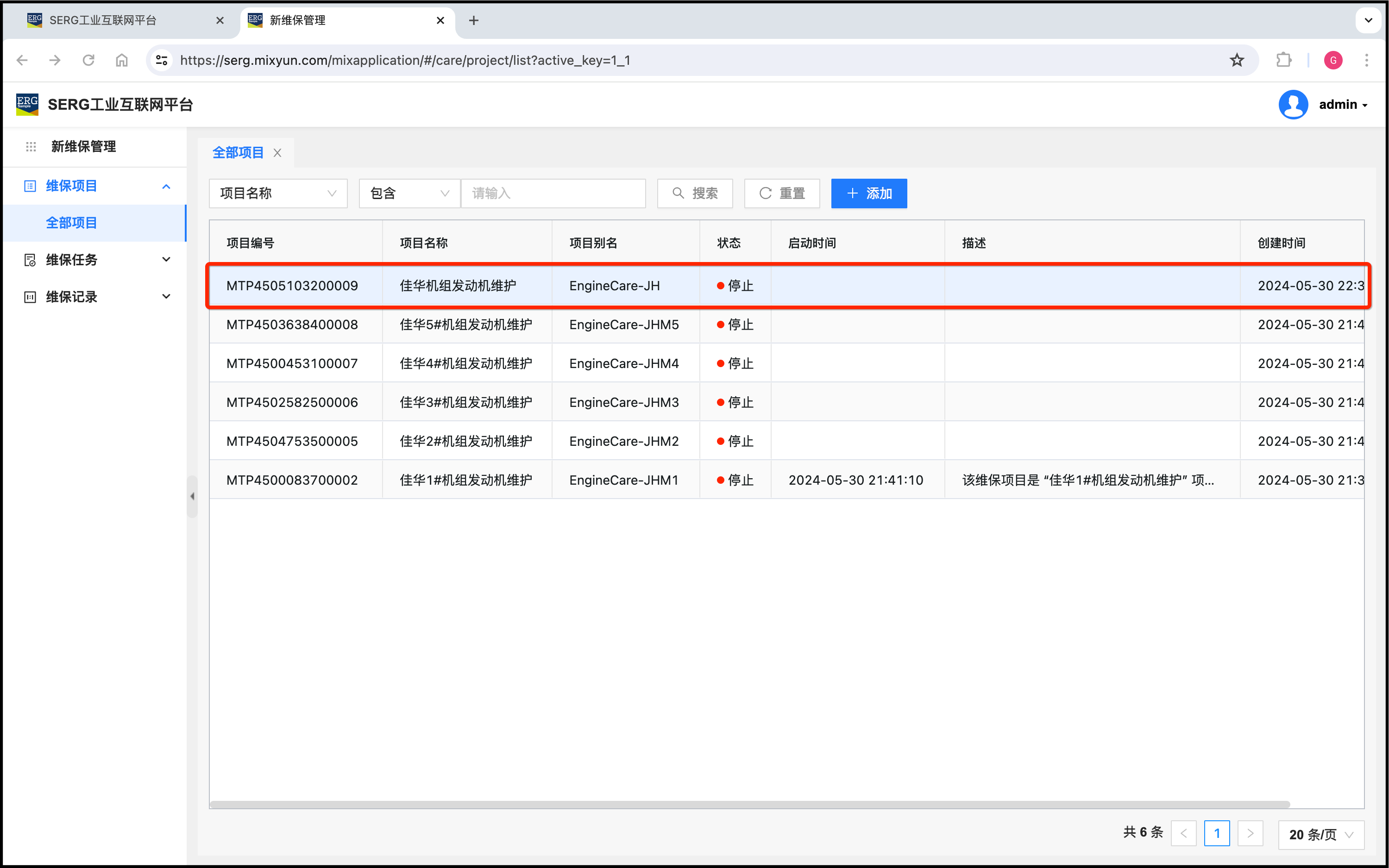 同样,可以为佳华电站的其他四个机组创建维保项目: